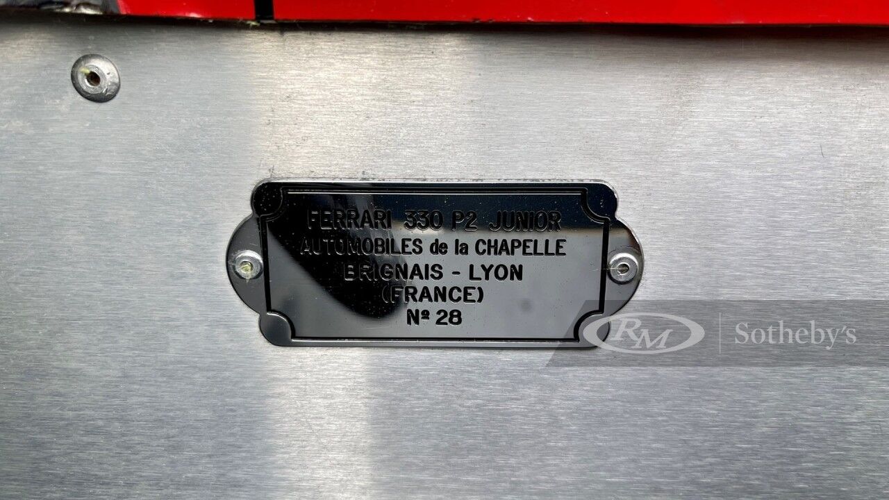 Este ejemplar muestra una placa con el número de serie “28”, y se sabe que fue pedida por encargo de un misterioso padre multimillonario quien también exigió para la carrocería el auténtico tono “Rosso Corsa”, un color muy particular celosamente registrado por Ferrari. Presentado en buenas condiciones, incluso 40 años después de que estos vehículos salieran al mercado, este Ferrari 330 P2 Junior fabricado por De La Chapelle sigue siendo un juguete imprescindible para cualquiera que tenga un Ferrari de tamaño completo en el garaje.