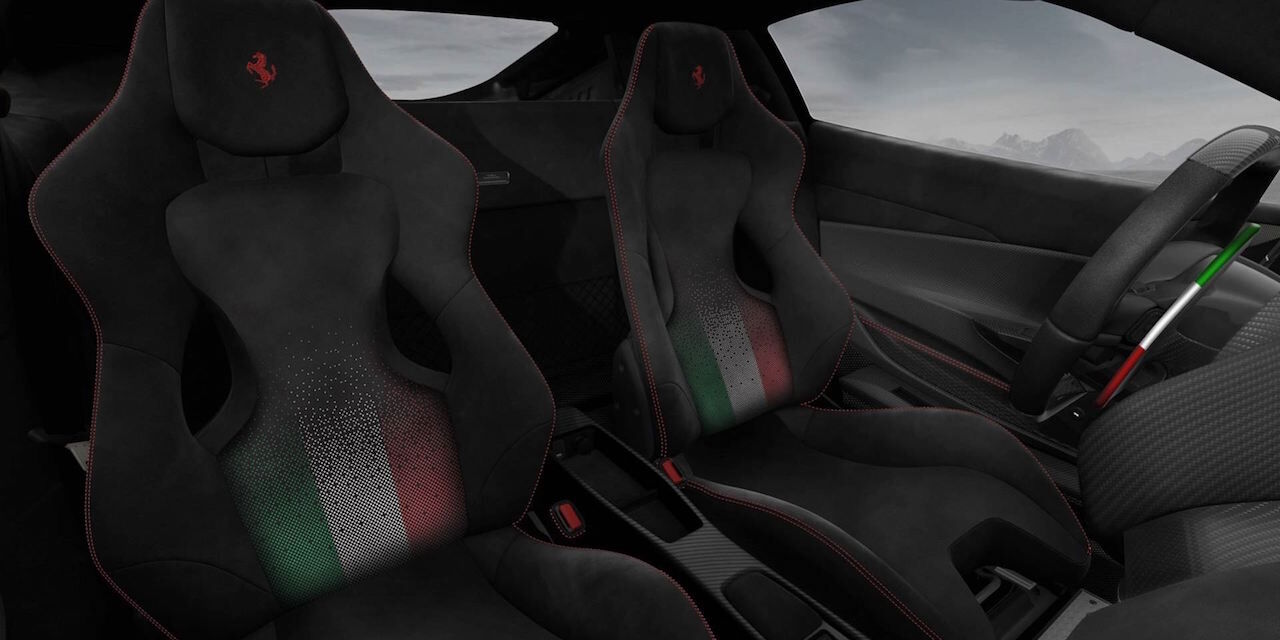 En el habitáculo lo más llamativo es la parte central de los bacquets, con la bandera italiana en el tapizado de Alcántara, colores que se repiten en las apabullantes levas para manejar el cambio que se encuentran tras el volante. Los umbrales de las puertas cuentan con molduras de fibra de carbono, material que también se emplea en la parte inferior del volante, donde se muestra el número con el que compite cada cliente en las carreras del Corse Clienti.