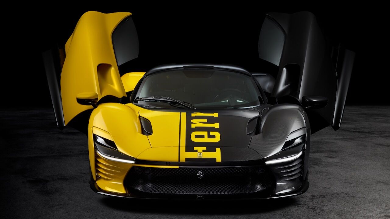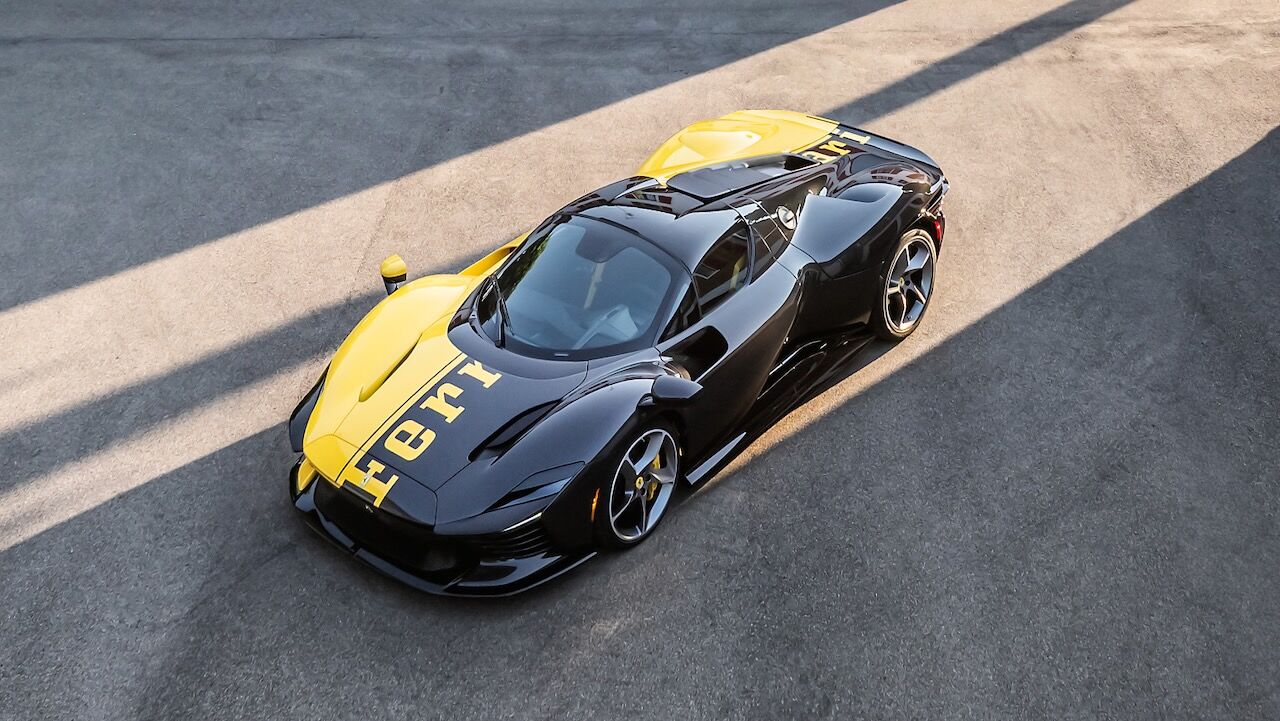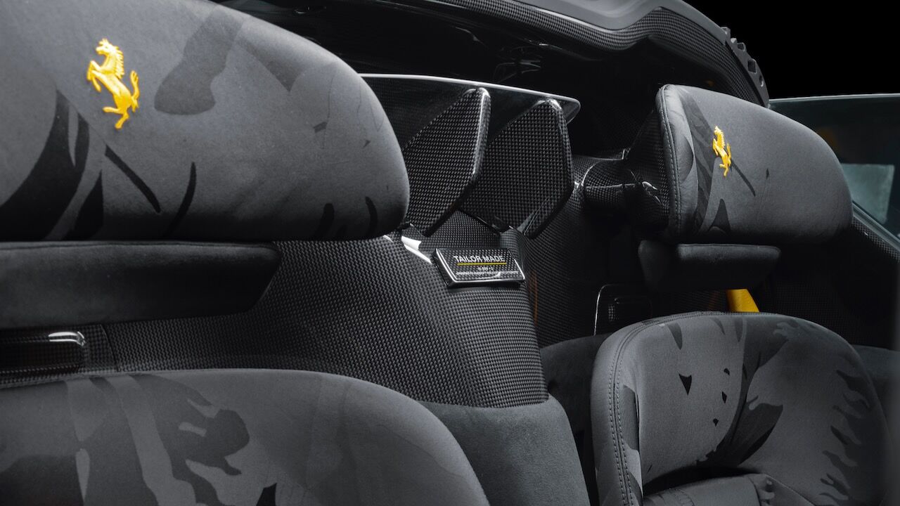 El motivo que explica el salto de precio de 2 a 26 millones de dólares está en su configuración absolutamente irrepetible. La carrocería luce un acabado bitono amarillo y negro, con el logotipo de Ferrari recorriendo sus líneas de forma inédita. El interior, por su parte, se viste con tejidos confeccionados a partir de materiales reciclados, mientras que el salpicadero y la columna de dirección están elaborados con la misma fibra de carbono del monoplaza de Fórmula 1 SF-25 de la Scuderia.
