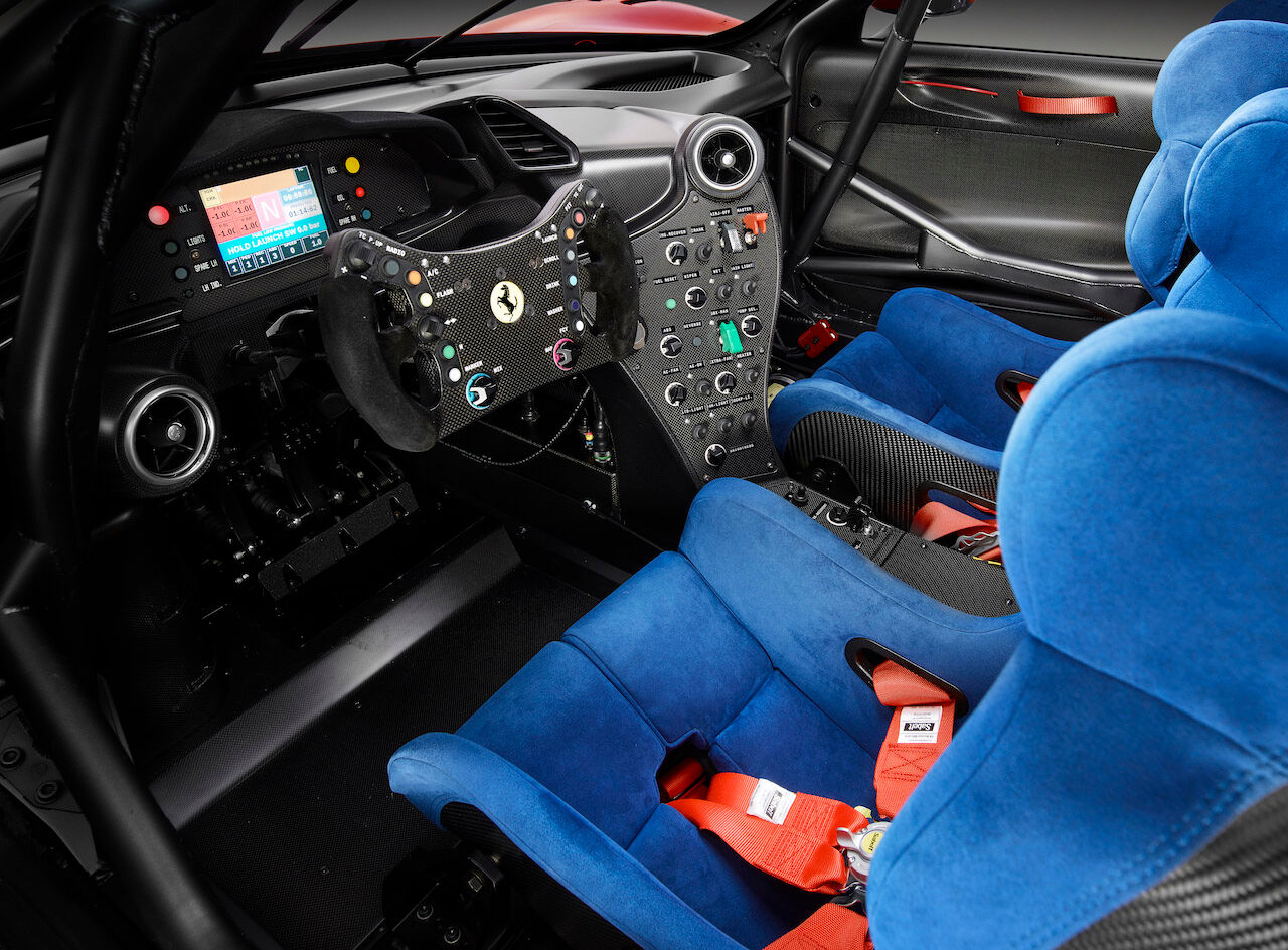 Tampoco se han seguido límites en su mecánica, que parece ser la misma V8 biturbo de 3.9 litros aunque sin las restricciones que se aplican en GT3. En el interior del Ferrari P80/C si que hay bastantes similitudes con el 488 GT3, con las medidas de seguridad de la FIA, asientos tipo baquet y un volante extraíble de lo más llamativo. No ha trascendido el nombre del afortunado cliente que se lo llevará a casa ni el precio que ha tenido que pagar por este ejemplar.