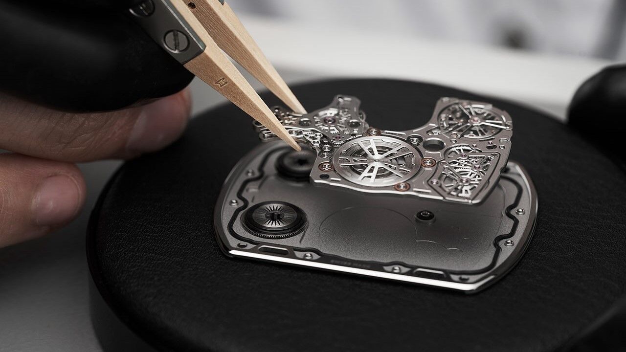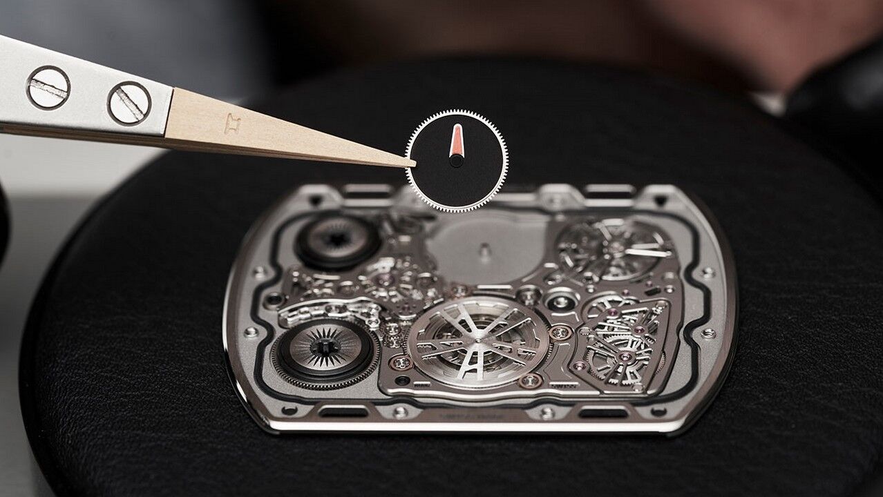 En lo que respecta a su mecánica, este es un reloj de cuerda, por lo que no necesita una pila: su reserva de funcionamiento solo exige que le demos cuerda, algo que habrá que hacer cada dos o tres días, puesto que cuenta con una autonomía (reserva de funcionamiento de 45 horas ). Para afinar el reloj es un grosor tan escueto, la táctica de Richard Mille fue la de distribuir los componentes en una gran superficie y reducir sus cotas al extremo.