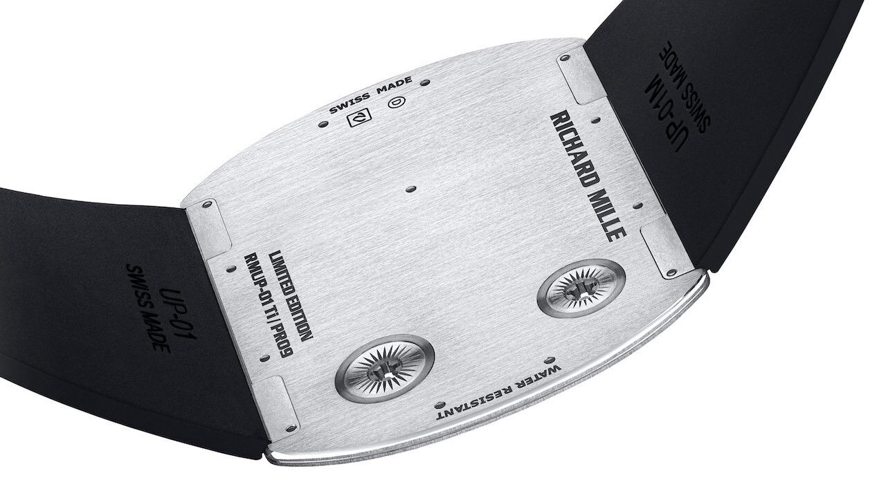 Comenzando por sus cotas, el RM UP-01 tan solo cuenta con un grosor de 1,75 milímetros desde la esfera hasta el fondo de la caja, superando al Bulgari Octo Finissimo Ultra por 0,05 mm como el reloj más delgado que haya existido. La placa base y los puentes del RM UP-01 están fabricados de titanio de grado 5 que también incluye un 6 % de aluminio y un 4 % de vanadio. Además, el movimiento tiene solo 1,18 mm de grosor, también un nuevo récord.