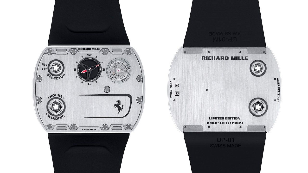 Richard Mille y Ferrari dicen que se necesitaron más de 6.000 horas de desarrollo previo para dar vida al RM UP-01. Como parte de este desarrollo, los ingenieros crearon un volante de titanio y un escape único junto con un rodillo de seguridad para transferir energía al volante que garantiza que el reloj pueda soportar el montaje, el desmontaje y la exposición a golpes o vibraciones fuertes.