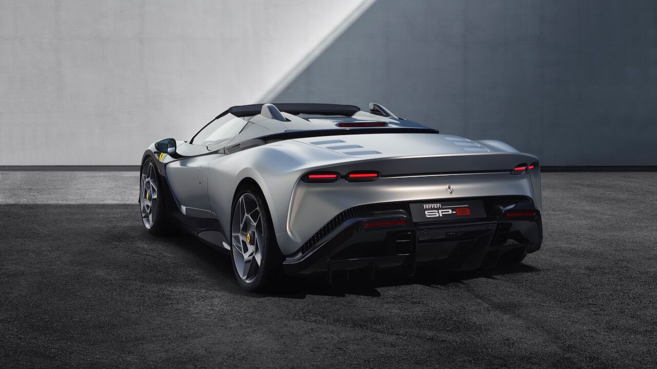 Al no tener techo, se ha podido jugar con la zaga del Ferrari SP-8, que cambia de forma sustancial. Se divide en una parte superior que es la tapa del motor con respiradores longitudinales y un volumen que sobresale haciendo las veces de spoiler. También se puede apreciar que cambian los pilotos traseros, que son derivados de los del Ferrari Roma. Además, presume de un interior propio por su configuración con Alcántara de color Azul Marino y grabados con láser junto con tela con efecto degradado, por no hablar de una consola central despejada para dejar sitio a la caja de cambios de F1 que debutó en el SF90 Stradale.