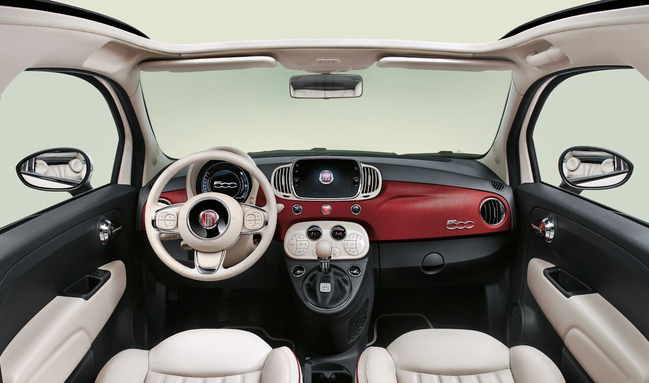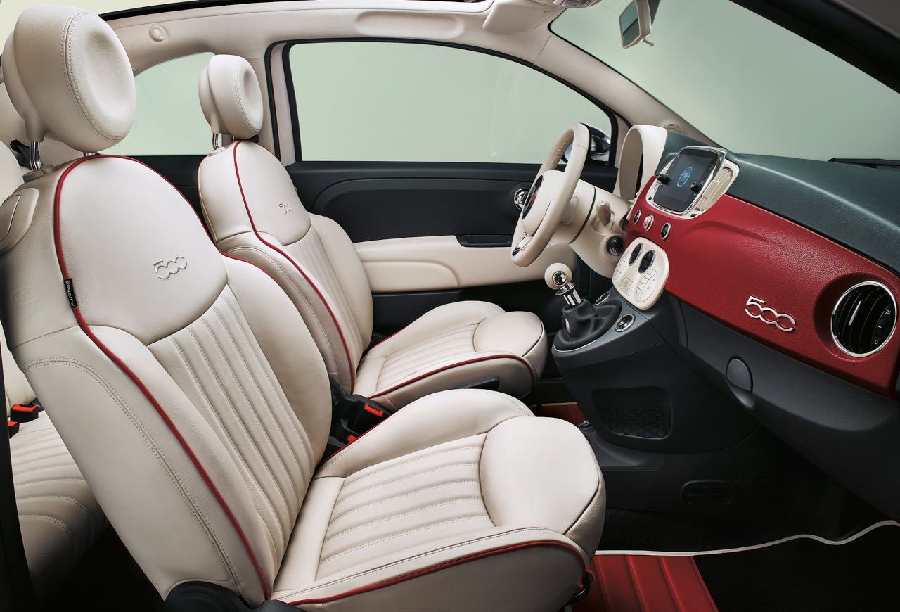 Los detalles retro también se trasladan al habitáculo, donde podemos encontrar un salpicadero de vinilo y la tapicería de piel color Marfil con las costuras en color Burdeos o las alfombrillas específicas bicolor. En cuanto al equipamiento, tiene lo mejor disponible: sistema Uconnect con pantalla TFT de 7 pulgadas con pantalla táctil, Bluetooth, navegador, puerto USB, conector auxiliar, climatizador automático, sensores de aparcamiento traseros, limitador de velocidad, control de crucero, sensor de luz y lluvia, faros bi-xenón, lunas traseras tintadas y sistema Beats Audio.