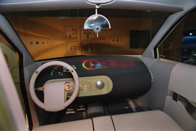 Como podemos observar, el salpicadero se convierte en una pantalla proyectada con una gran variedad de iconos, que permiten al conductor controlar todo desde una superficie de lo más plana. Es decir, es como si tuvieses una tablet enorme en el salpicadero que te permitiese hacer cosas impensables en ese año.