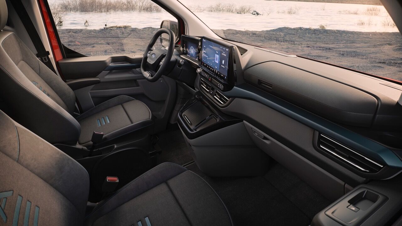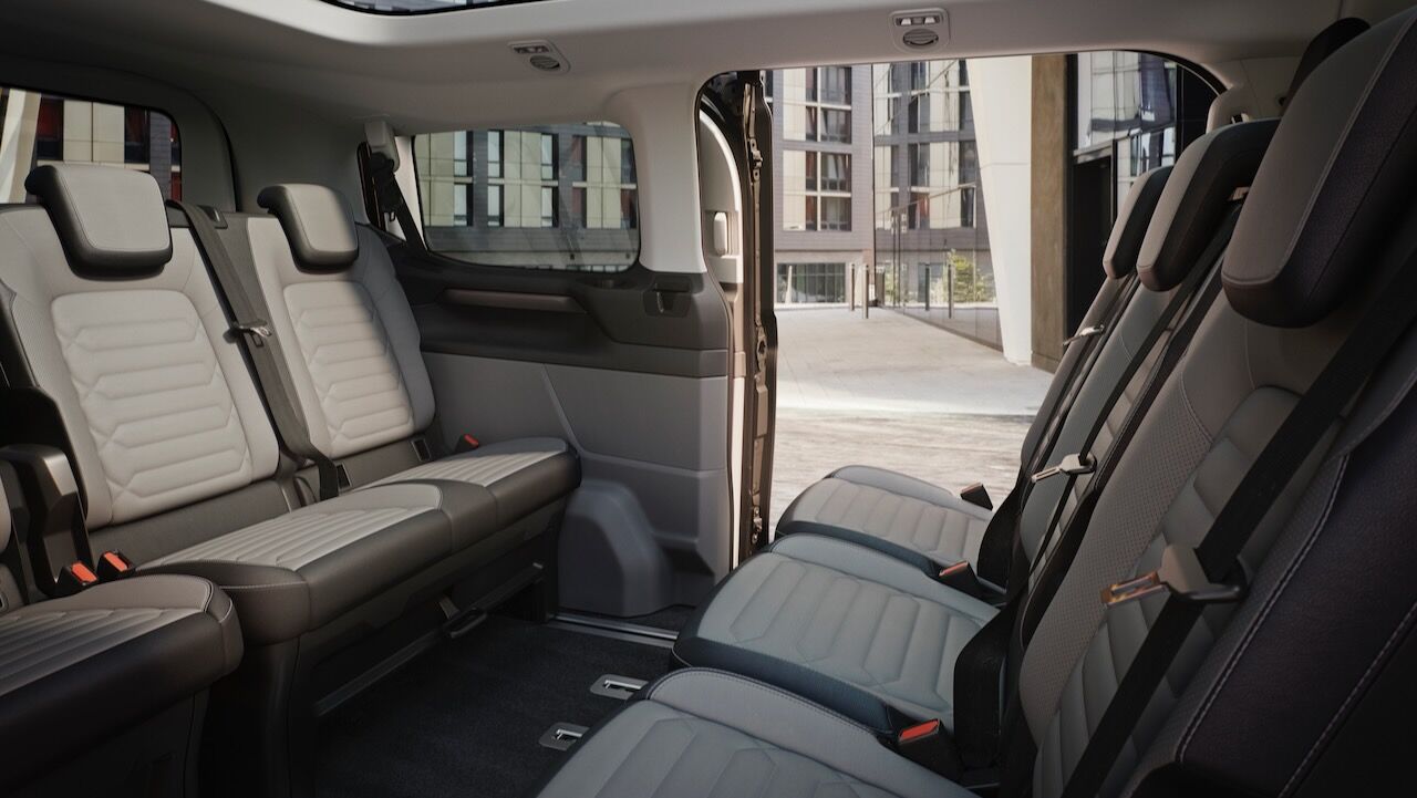 Una vez dentro del Ford E-Tourneo Custom ahora los asientos van montados sobre raíles en la segunda y tercera fila. Eso permite una mayor modularidad al poder moverse de forma independiente e incluso ser retirados (más fácil al ser más ligeros). El habitáculo gana calidad y consigue una atmósfera agradable gracias a elementos como el techo panorámico de cristal, las puertas laterales con accionamiento eléctrico, al climatizador trizona o un nuevo sistema de sonido B&O con 14 altavoces y un subwoofer.