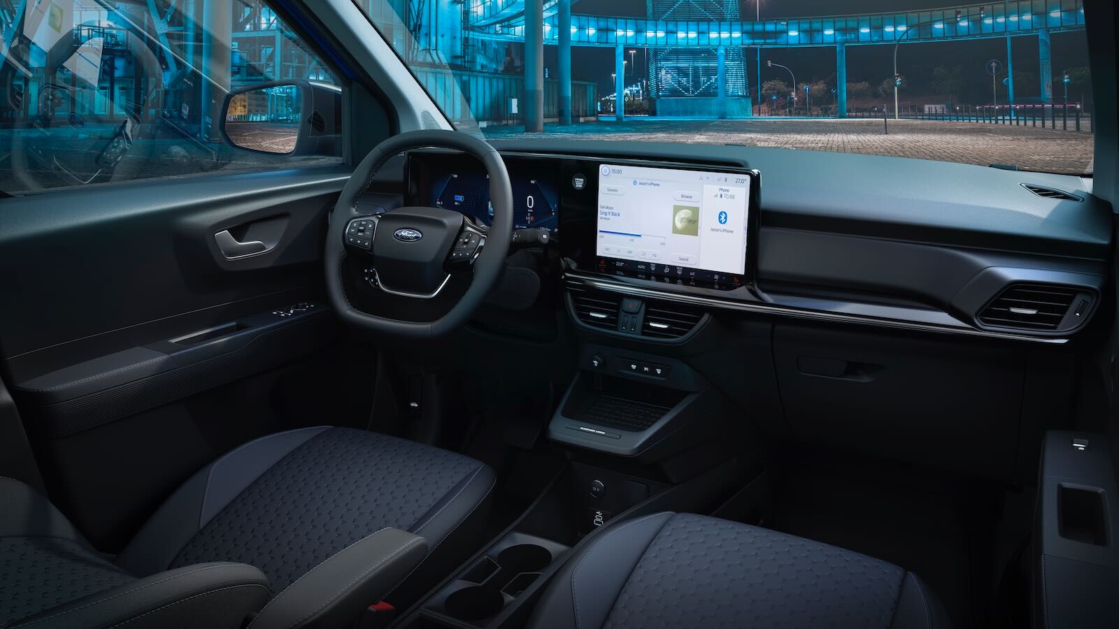 El habitáculo del Ford E-Transit Courier cuenta con un cuadro de instrumentos digital de 12 pulgadas y una pantalla táctil del mismo tamaño con el último sistema SYNC 4 de Ford, compatible con Android Auto y Apple CarPlay de serie. No falta una superficie de trabajo plana plegable en la que es posible usar un ordenador portátil o una tablet.
