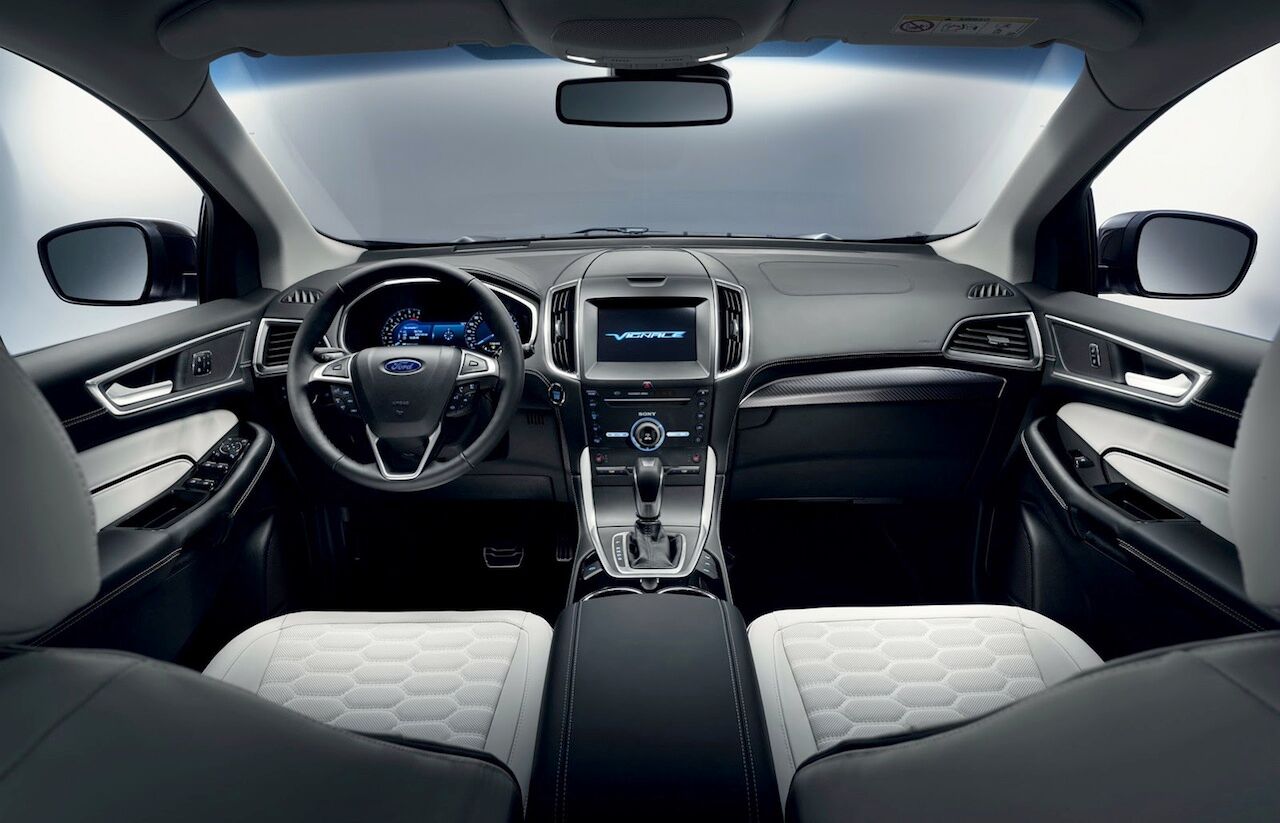 El interior del Ford Edge Vignale lo más destacado es la piel que encontramos en asientos, superficie superior del salpicadero, paneles de las puertas, reposabrazos.. con diseño hexagonal y con costuras estilo «esmoquin» muy marcadas, exclusivas de esta versión. Se ha mejorado también el aislamiento, con alfombrillas más gruesas o el sistema de Control Activo de Sonido, y la iluminación ambiental es diferente.