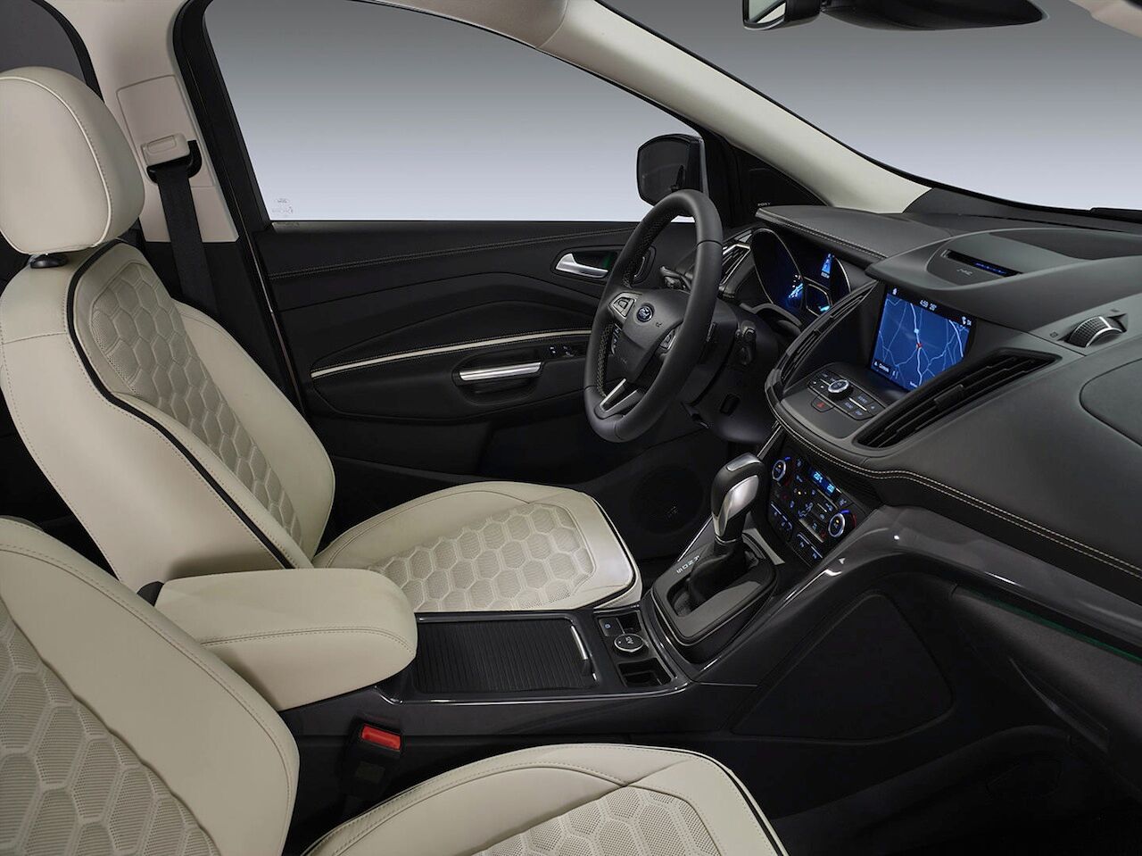 Ya en el interior el Ford Kuga Vignale cuenta con un tapizado en piel Windsor con prominentes costuras hexagonales acolchadas en asientos e interiores de las puertas, en color Cashmere. El lujoso tratamiento de la piel también se extiende al panel de instrumentos. Estos modelos se rematan a mano por maestros artesandos en Valencia.