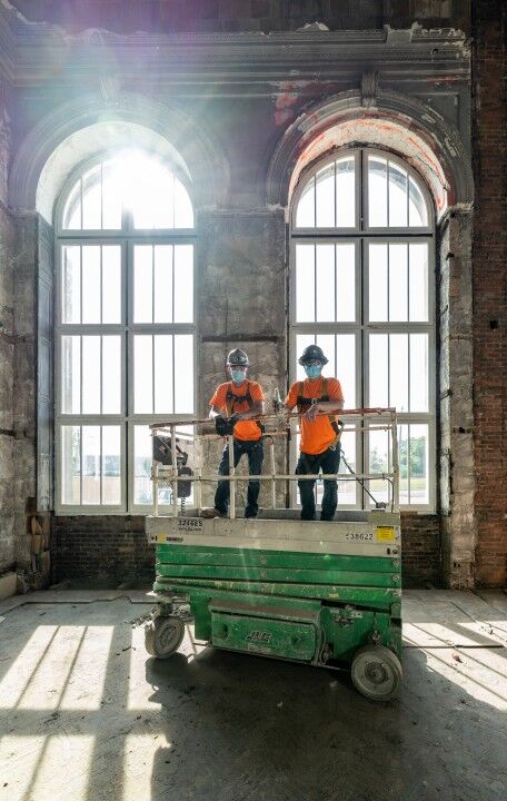 Hay más de 400 trabajadores que actualmente trabajan en el sitio diariamente, haciendo reparaciones de mampostería e instalando techos, suelos, ventanas, plomería y sistemas eléctricos. Los equipos también están ocupados restaurando el magnífico techo abovedado de Guastavino en la antigua sala de espera –que cuenta con tres arcos autoportantes– y arreglando cornisas de terracota y capiteles de piedra caliza en el exterior del edificio. La construcción de este icónico edificio se completará a finales de 2022.