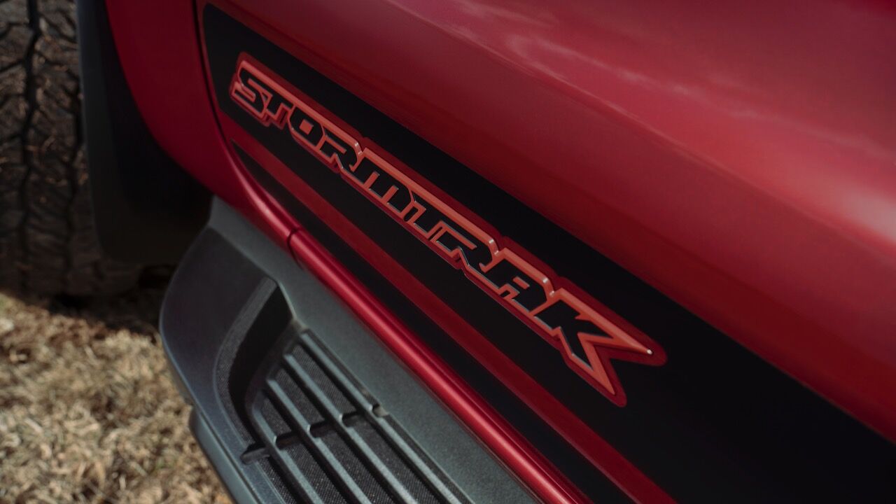 Ese último elemento viene opcionalmente en otros acabados y destaca por la comodidad y facilidad de uso al permitir al usuario abrir o cerrar la plataforma de carga desde el botón del llavero. Además, cuenta con función antipinzamiento para evitar pillar los dedos del usuario o dañar la carga. En el interior del Ranger Stormtrak se pueden ver unos asientos específicos con la tapicería de cuero del Ranger Raptor, logotipos de la versión bordados y refuerzos tapizados con tejido técnico. En esquema de colores utilizado en el habitáculo es de superficies interiores en color Graphite y las costuras rojas haciendo contraste.