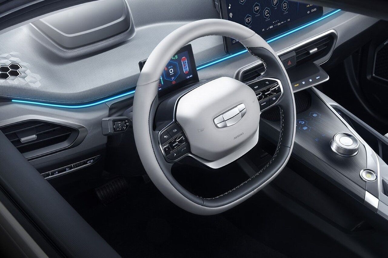 Aunque su exterior no cautiva en exceso, parece que el habitáculo y el equipamiento ha sido bastante cuidado. Aparentemente, se ve bien, al menos hasta que se puedan tocar los materiales y sus ajustes. Hay un pequeño y elegante HUD para el conductor, y una pantalla de grandes dimensiones que hace de sistema de infoentretenimiento. Geely ha optado por la “elegancia minimalista y vanguardista”, dedicando tiempo a los detalles. Por ejemplo, con pequeños patrones geométricos se desarrollan fuera de las superficies planas en lugares que no distraen la atención, o la sección luminosa tras el selector de cambio.