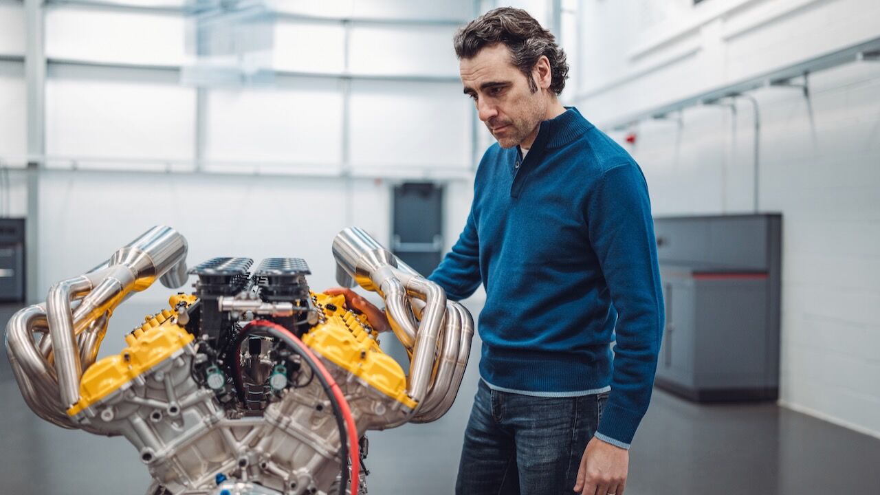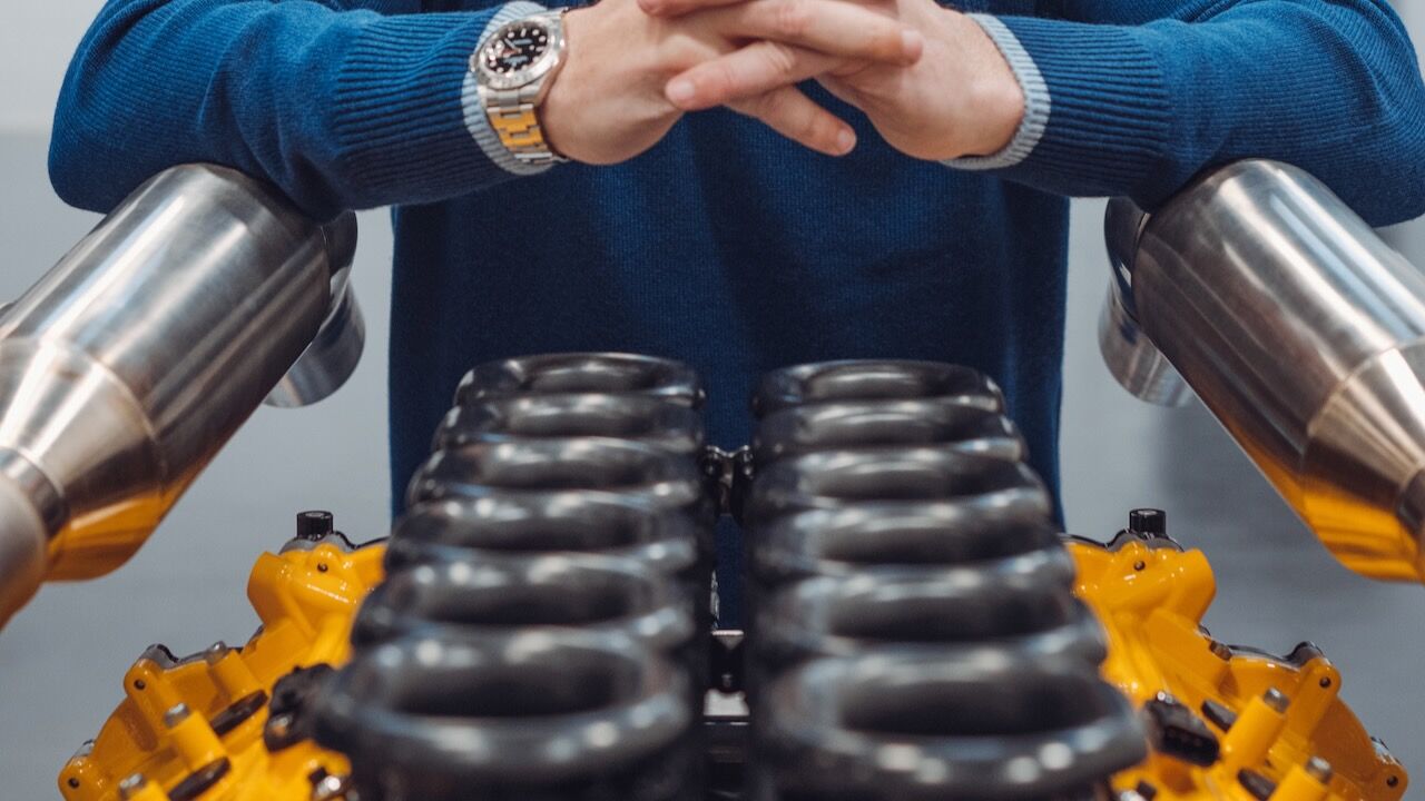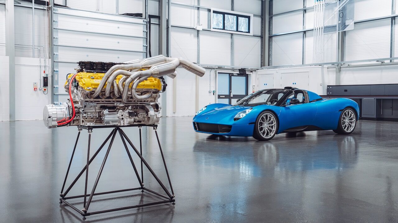 Aunque la verdadera clave del GMA T.33 Spider es la mecánica V12 atmosférica de 3.9 litros, una proeza de la ingeniería hecha por Cosworth que tiene los cilindros enfrenados a 65º y que es realmente compacta y ligera (apenas 178 kg). No hay nada parecido en el mercado actualmente, pues es un ejemplar que alcanza 617 CV y 451 Nm de par, siendo capaz de alcanzar las citadas 11.100 rpm. Solamente está disponible con una caja de cambios manual Xtrac de seis velocidades que pesa 82 kg, como veis todo favorece el bajo peso del superdeportivo.