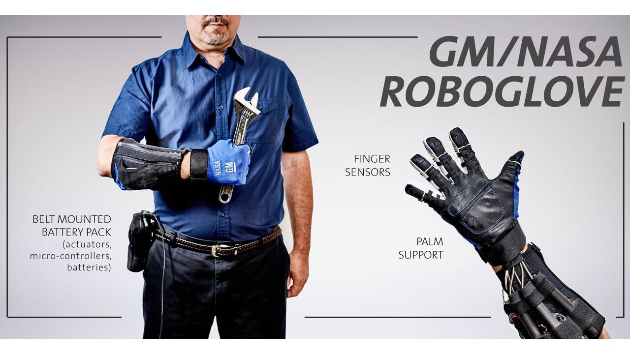 GM y NASA pasaron nueve años desarrollando la tecnología Soft Extra Muscle para su uso en un robot espacial que se lanzó en 2011. El RoboGlove sería algo así como un exoesqueleto blando. Utiliza sensores especiales tipo «tendón» para ayudar a multiplicar la fuerza de agarre del usuario. El operador lleva una batería montada en el cinturón, además de un guante con sensores para los dedos y una envoltura del brazo que contiene la mayoría de los sensores y actuadores.