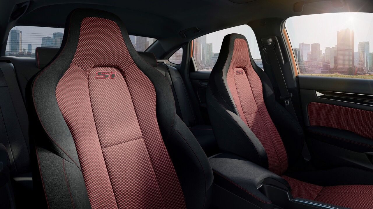 A bordo, piloto y copiloto podrán disfrutar de asientos deportivos exclusivos con reposacabezas incorporados y soportes para hombros y muslos más prominentes. El cojín inferior se ha elevado 13 mm para proporcionar mejor soporte. El nuevo Civic Si también viene con pedales deportivos y costuras rojas contrastantes en las puertas, el volante, el reposabrazos y el pomo del cambio. Una pantalla de 7” hace de cuadro de instrumentos, una táctil de 9” tiene conexión inalámbrica con Apple CarPlay y Android Auto, y adjunto hay un equipo de sonido Bose.