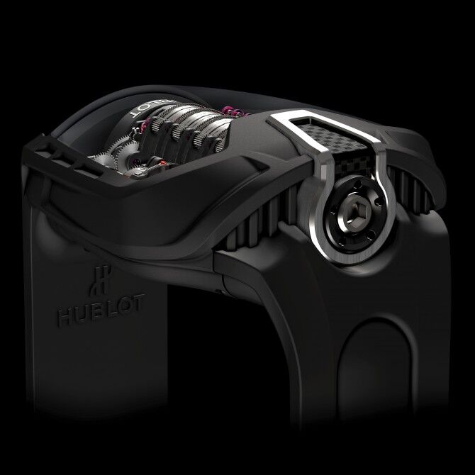 El reloj, muy trabajado desde el punto de vista de la forma, en particular, gracias a un cristal de zafiro de forma compleja que recuerda claramente a las líneas del vehículo y a un fondo abierto, se ha realizado en titanio con PVD negro. En la parte superior central, una inserción de titanio y carbono revela la corona de remontaje. La corona de puesta en hora, por su parte, está situada debajo de la caja. Ambas están totalmente integradas en el diseño, de modo que resultan prácticamente invisibles.