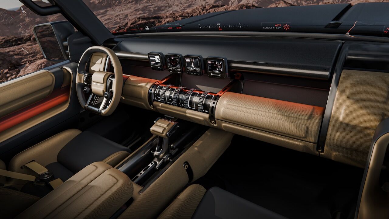 Y es que este prototipo tiene la clara vocación de poder abandonar el asfalto con garantías, de ahí que se asiente sobre neumáticos todoterreno de 37 pulgadas que le otorgan una altura libre al suelo muy notable. No dan detalles concretos sobre los ángulos de ataque, salida y ventral; pero queda claro que puede sortear obstáculos y tendrá una gran capacidad de vadeo. Además, incorpora un sistema de guía todoterreno en tiempo real que ayuda al conductor a realizar maniobras que sean más complejas.