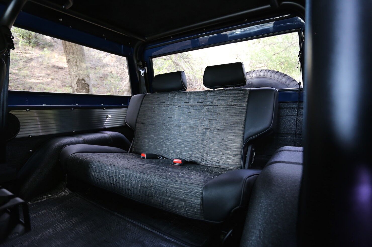 En el interior, una vez aislado a conciencia, se emplean materiales de primera calidad. El cuero de los asientos es el mismo que usa Mercedes... y en el salpicadero se coloca la instrumentación guardando la estética del primer Bronco, aunque con mandos modernos. Todo por combinar un estilo vintage del todoterreno con tecnología moderna... De este modo la iluminación interior es de diodos.. con elevalunas manuales