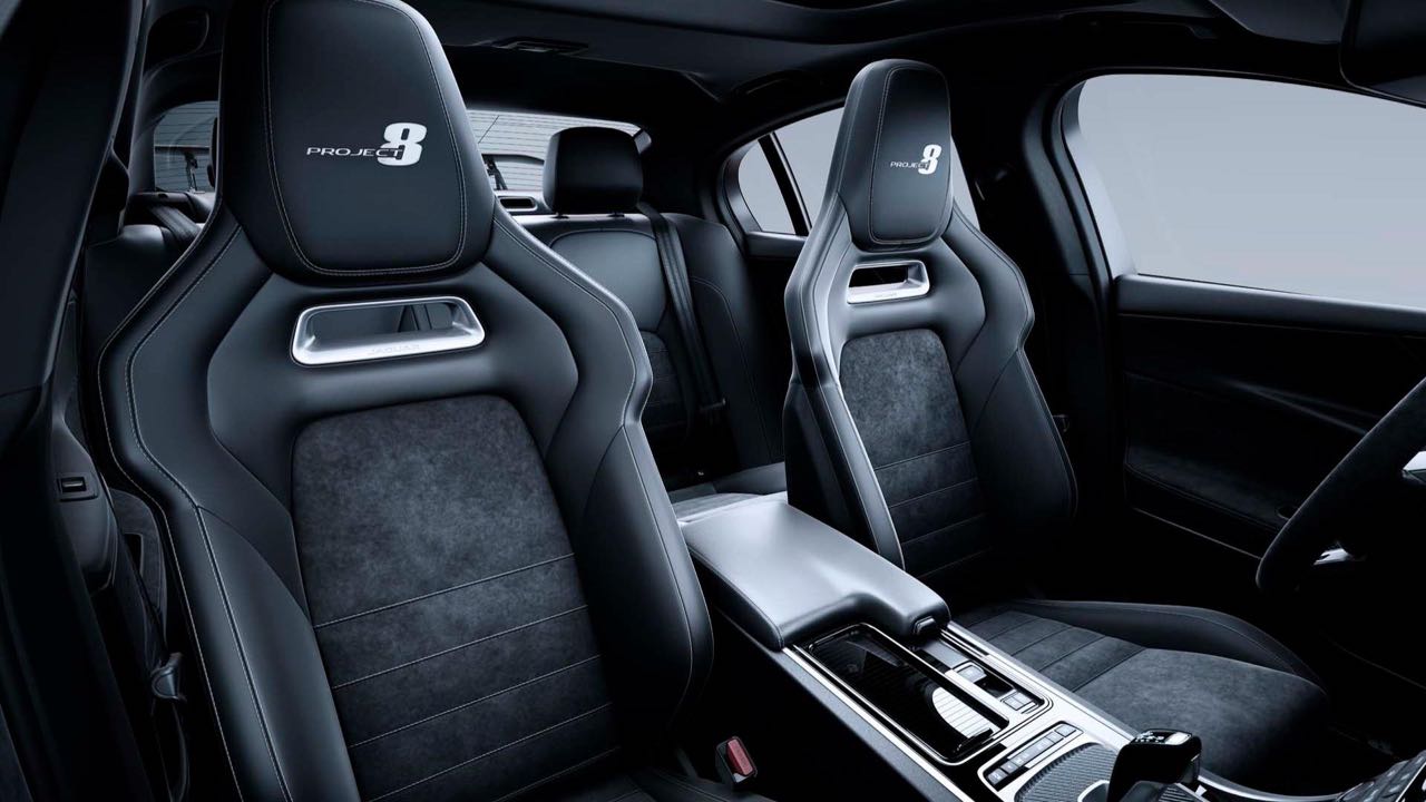 El Jaguar XE SV 8 se ofrecerá tanto en variante de cuatro plazas como con un paquete especial Track Pack que deja solo dos asientos delanteros de competición y permite ahorrar hasta 12,2 kilogramos de peso. En su exterior, el modelo ha sido equipado con paneles de aluminio, un parachoques y capó de fibra de carbono, un alerón trasero ajustable, y unas ruedas de aluminio forjado de 20 pulgadas.