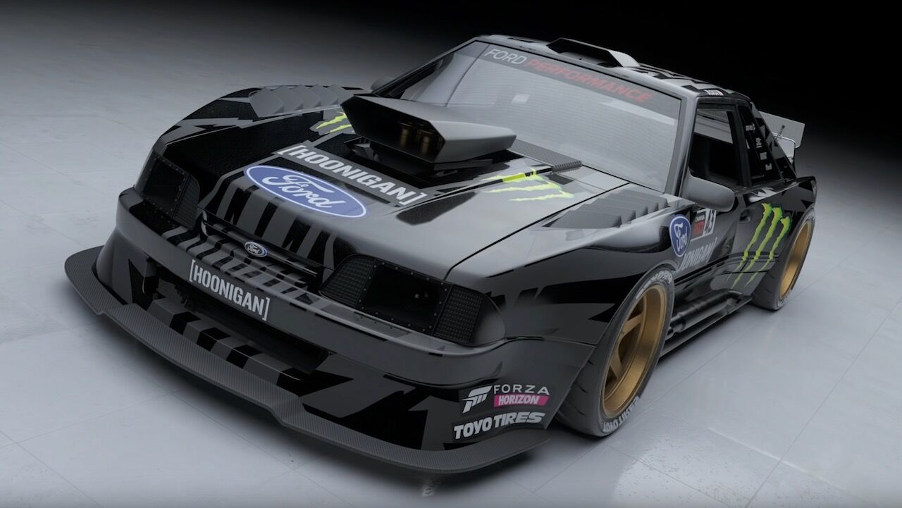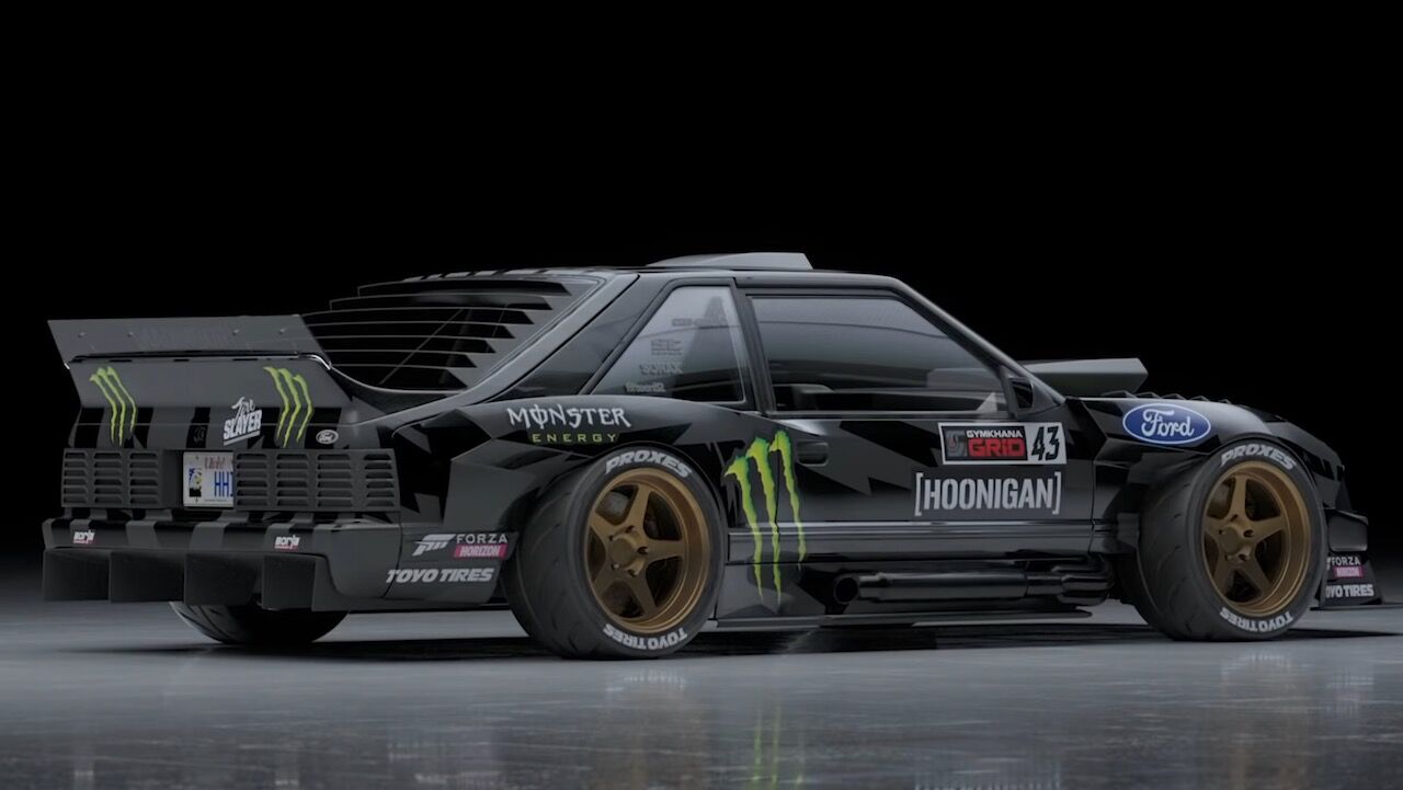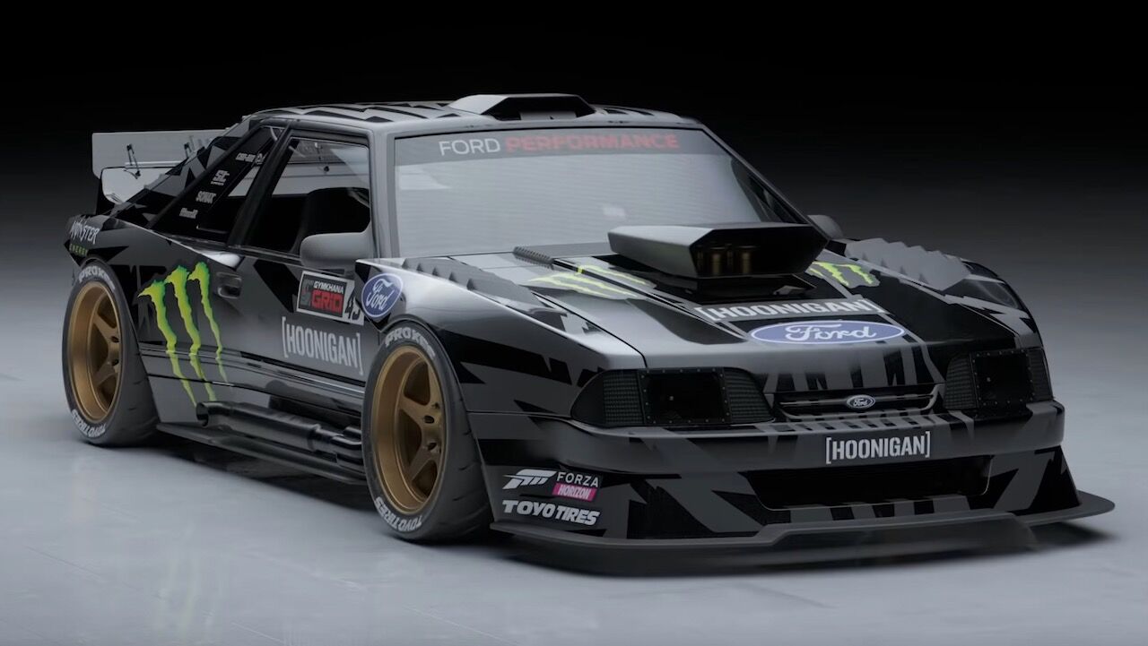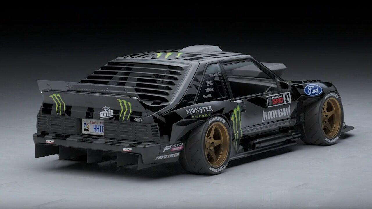 El nombre de este coche viene de la combinación de la marca de Block (Hoonigan) con el tipo de carrocería que lleva el clásico Ford. Porque se trata de un Mustang Fox-Body, que así es como se conoce a la tercera generación del modelo que se asentaba sobre la plataforma Fox de la marca. Salió a principios de los 80 y de ahí que tome una estética tan representativa de la época. Aunque en este ejemplar estaba claro que todo se iba a magnificar.