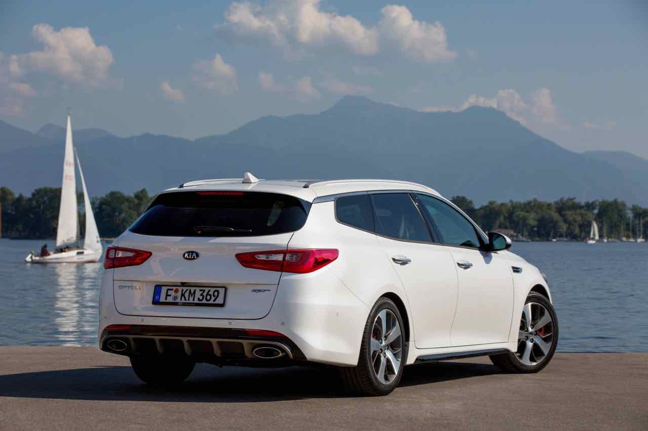 En la vista lateral destacan las llantas de aluminio de 18 pulgadas de nuevo diseño, que dejan ver pinzas de freno de color rojo y discos ventilados mayores, así como molduras laterales y tiradores de las puertas de cromo satinado. Los estribos, en negro brillante, también son diferentes al resto de la gama del Optima 2016. La trasera muestra un emblema especial y un nuevo difusor con doble salida de escape en sus extremos. Podrá elegirse con todos los colores disponibles en las versiones convencionales.