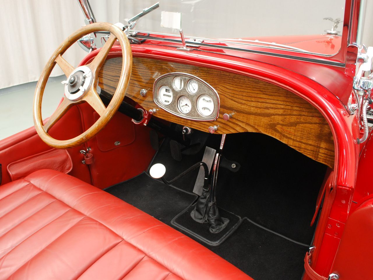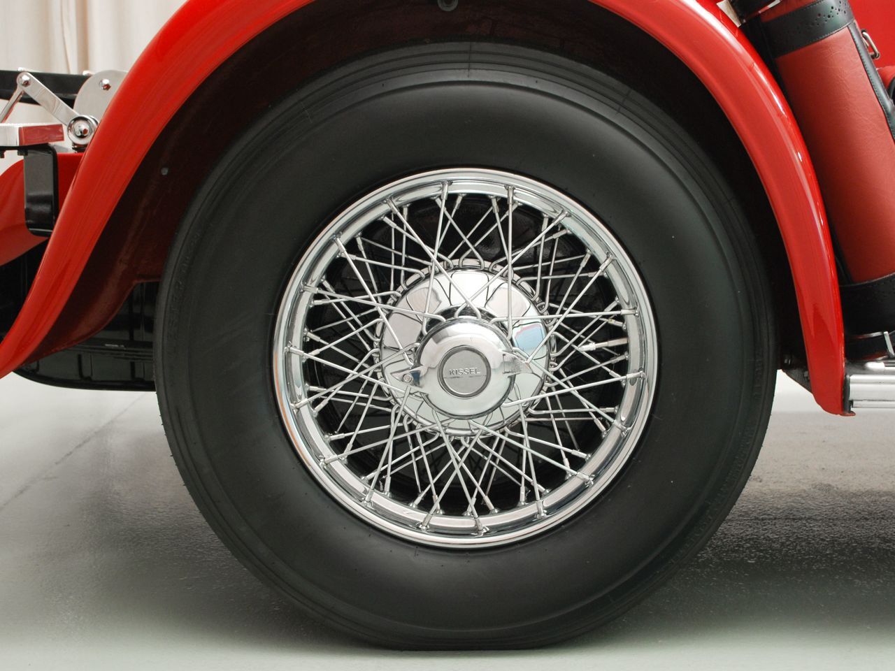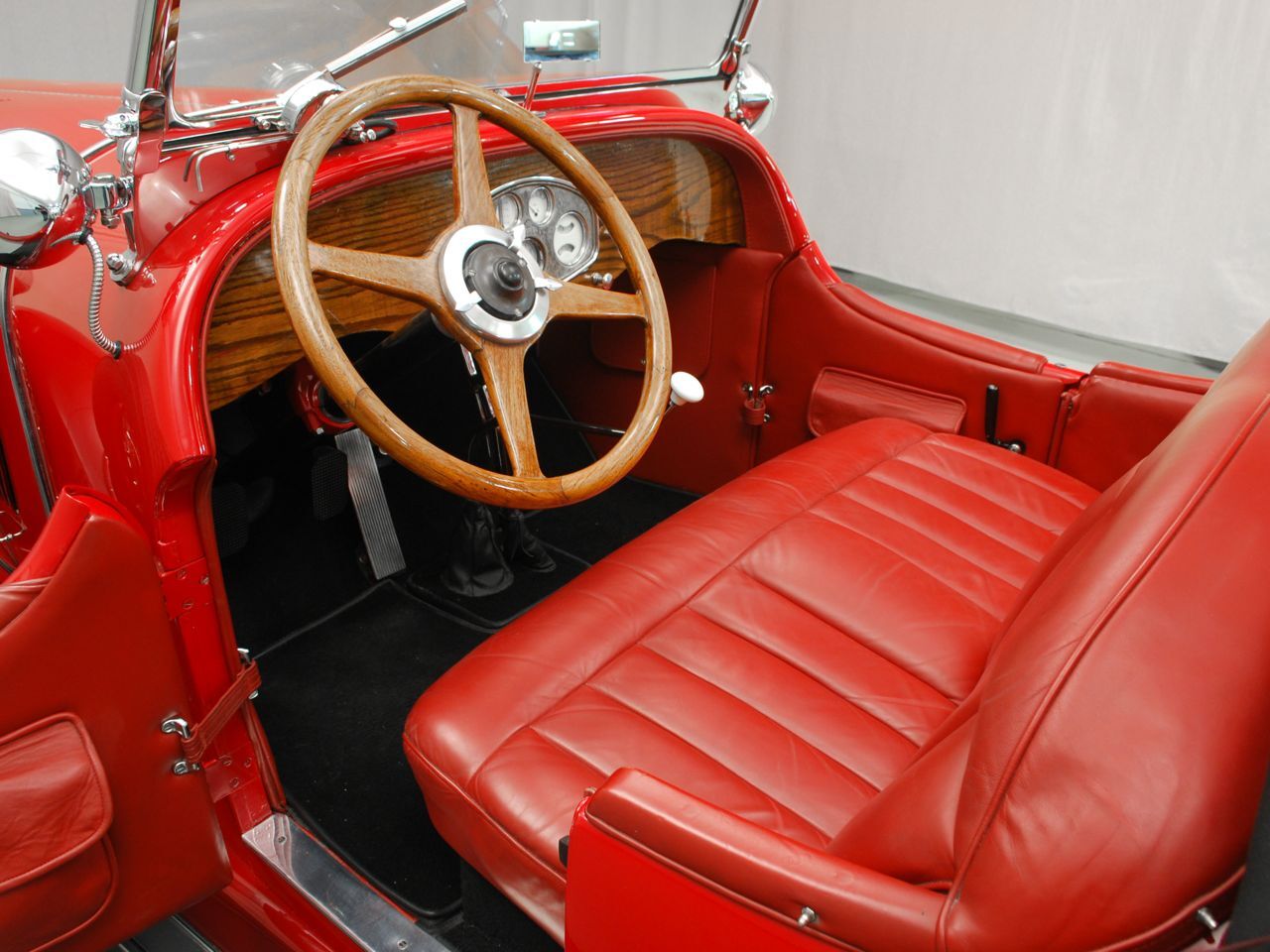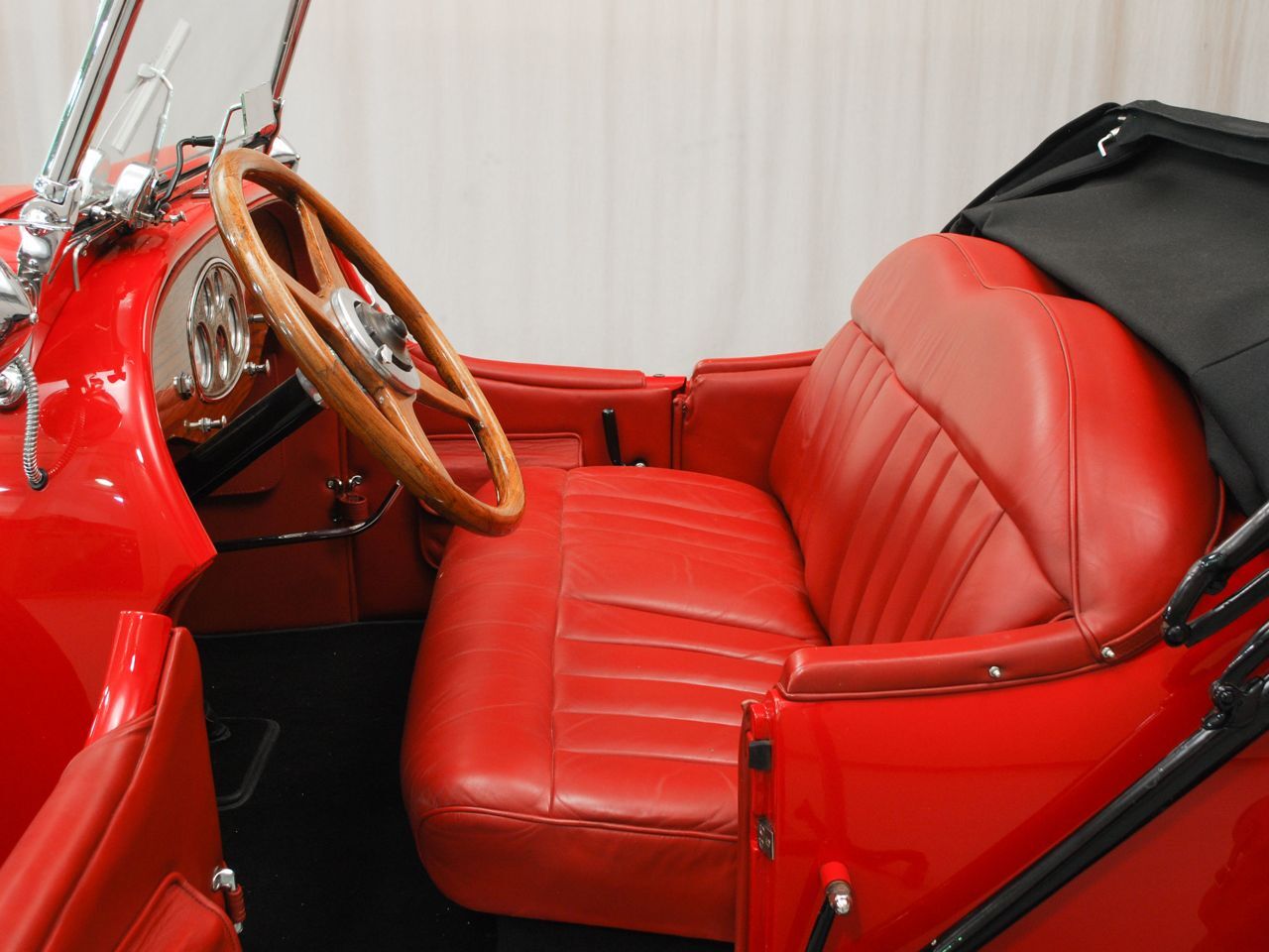 Dentoro, nos hemos enamorado del volante de cuatro radios de madera, en un tablero de instrumentos también de madera, totalmente barnizada, dura y sólida. La tapicería, roja como el exterior y el techo de lona negro, contrastan con las ruedas cromadas y neumáticos negros. El y sustancial como la Kissel sus gracias.