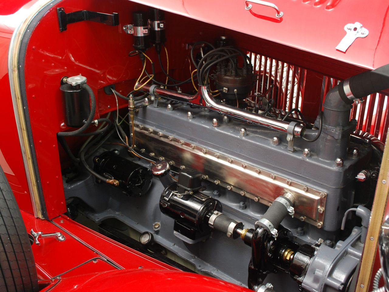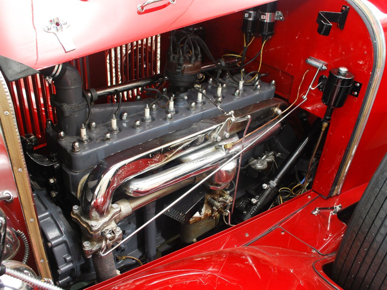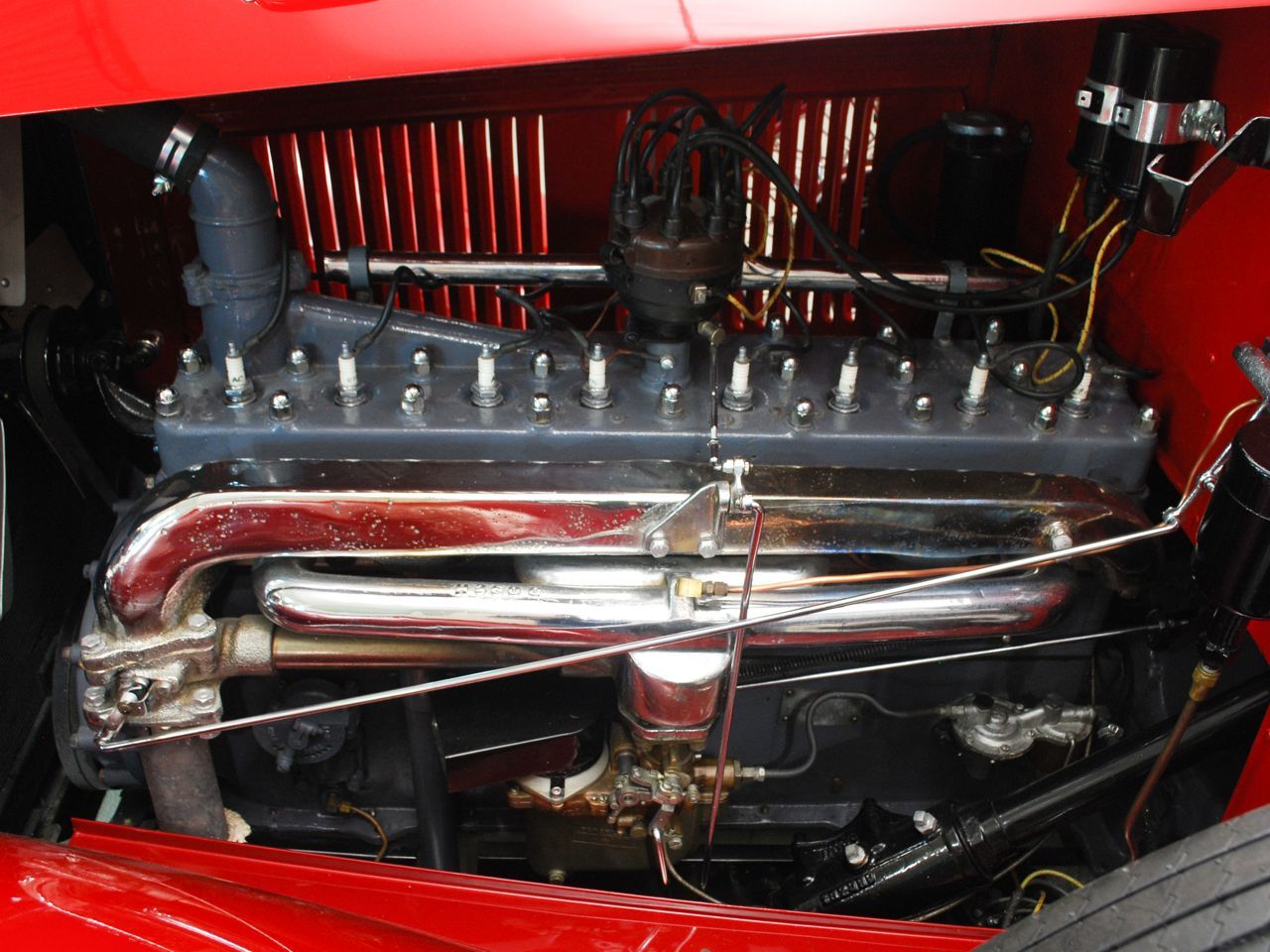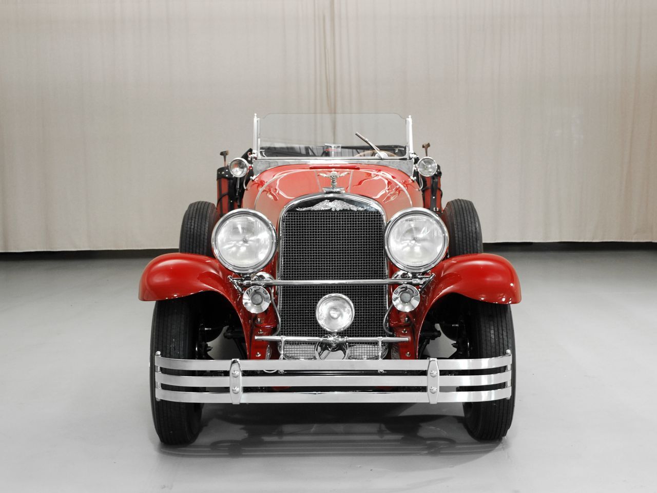 Dentoro, nos hemos enamorado del volante de cuatro radios de madera, en un tablero de instrumentos también de madera, totalmente barnizada, dura y sólida. La tapicería, roja como el exterior y el techo de lona negro, contrastan con las ruedas cromadas y neumáticos negros. El y sustancial como la Kissel sus gracias.