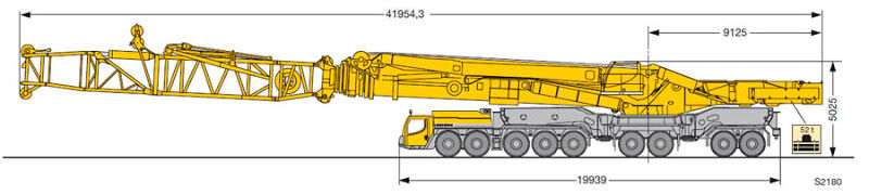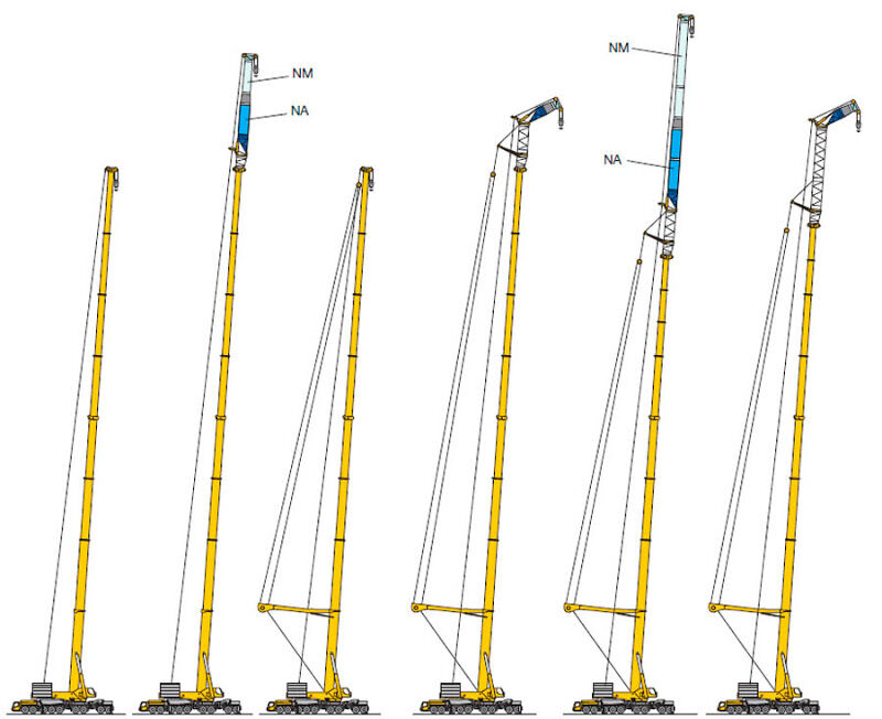 Existen diferentes versiones, en función de la longitud de la pluma. La T3 es la más básica y puede elevar 1.200 toneladas hasta 50 metros de altura (como subir 1.000 coches pequeños de golpe a un edificio de 15 pisos). Luego, a medida que aumentas la altura, se va reduciendo el peso de la carga. La mayor pluma es la T7, que llega a los 100 metros de altura y que puede llegar con extensiones a los 130 metros. Hasta ahí «solo» puede subir 160 toneladas. Pero hay más. hay un brazo accesorio (YVEN2) para que suba su altura hasta los 196 metros.