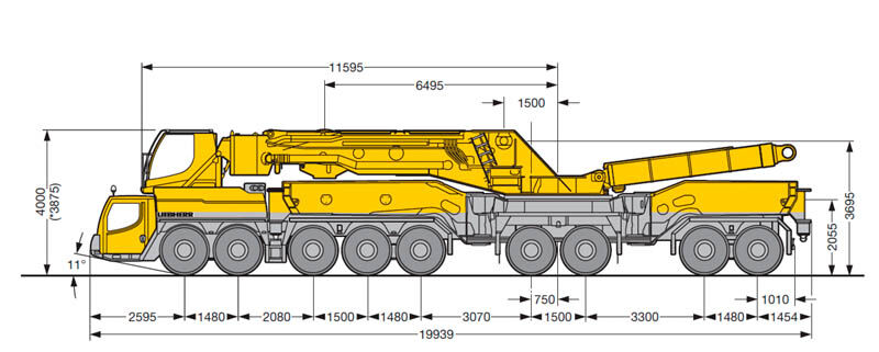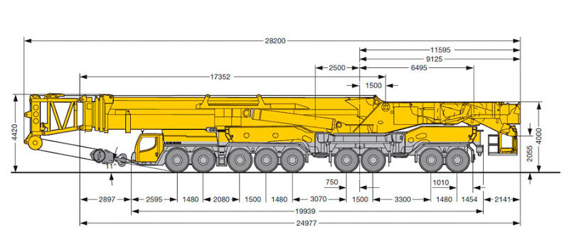 Esta megagrúa pesa 96 toneladas en orden de marcha y su chasis de acero de alta resistencia se diseñó pensando en soportar los enormes pesos cuando la carga está suspende en el aire. La base está alimentada por un motor turbodiésel Liebherr de 8 cilindros que rinde 680 CV de potencia con un par máximo de 3.000 Nm entre las 1.100 y las 1.500 rpm.