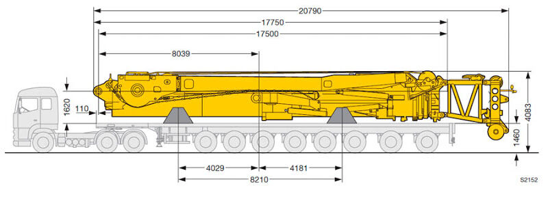 Por supuesto, se necesita un contrapeso eficaz en esa base móvil. Puede alcanzar las 202 toneladas, además de cuatro brazos estabilizadores de 14 metros de longitud, hidráulicos, para apoyan en el suelo con fuerza hidráulica. La base móvil tiene nueve ejes directrices, con direción asistida y dotados de una suspensión neumática de alta resistencia.