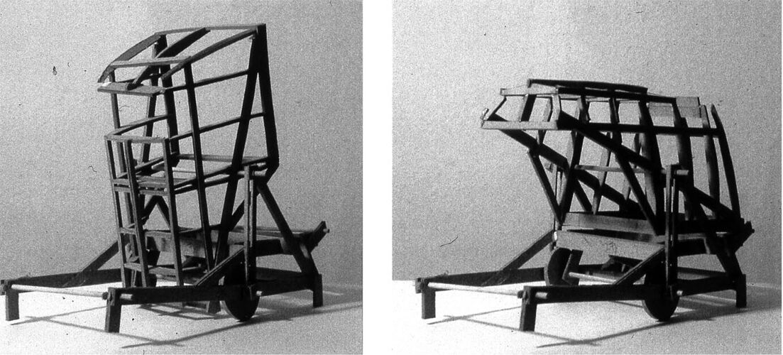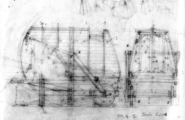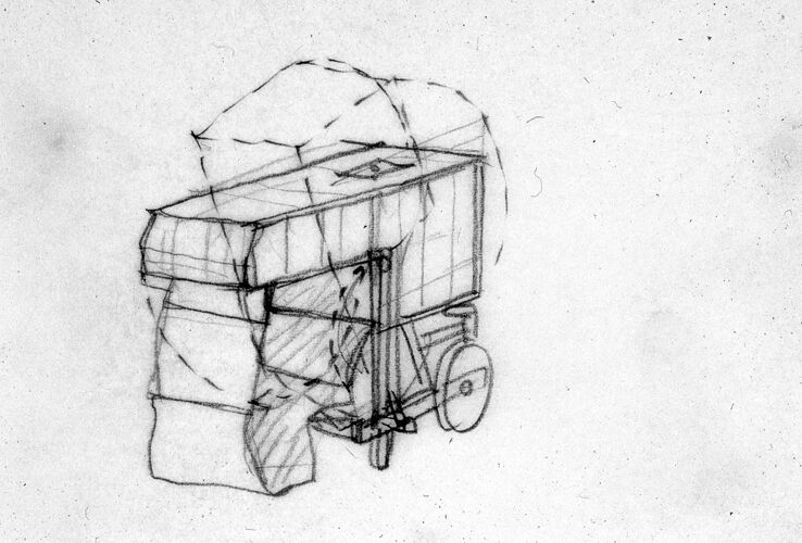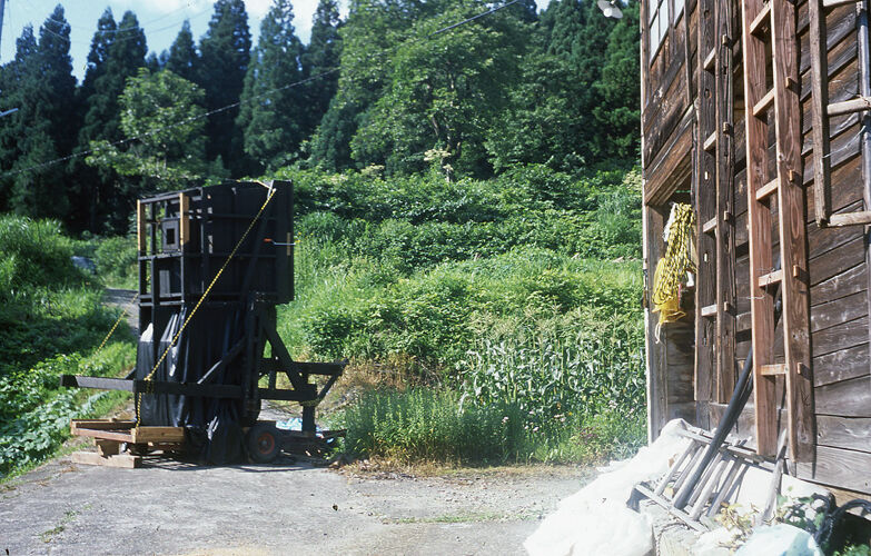 Pero echémosle un ojo primero a la estructura, de madera. Egashira explica en su libro Before Object, After Image: Koshirakura Landscape, 1996-2006, «que este vehículo cámara podía cambiar de una posición horizontal (cuando estaba en tránsito o era usada como cuarto oscuro) a una posición vertical fija, que permitía a una persona sentarse dentro y ver la imagen invertida».