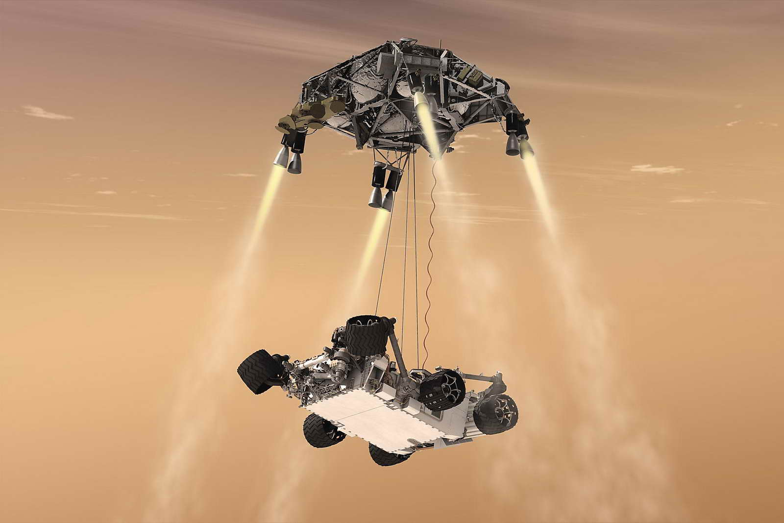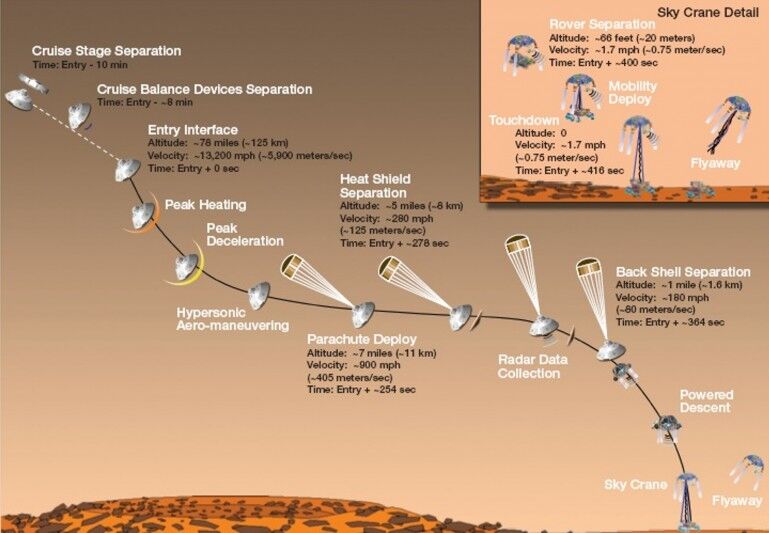 ¿Por qué esos nervios? Este control automático tenía que funcionar cuando llegó a la atmósfera marciana a 5.900 metros por segundo (casi 21.000 km/h). Ahí entraban en acción unas fuerzas de deceleración de hasta 11 g, controladas con un escudo térmico revolucionario, capaz de volar. Luego se desplegaba un paracaídas supersónico, exactamente en el momento oportuno, se desprendían los escudos y finalmente se dejaba dejar caer el Rover Curiosity suavemente sobre la superficie, utilizando una grúa controlada por cohetes. El propósito de todo esto era para que el Rover Cusiosity llegase de forma segura a la superficie de Marte... Y todo funcionó a la perfección.