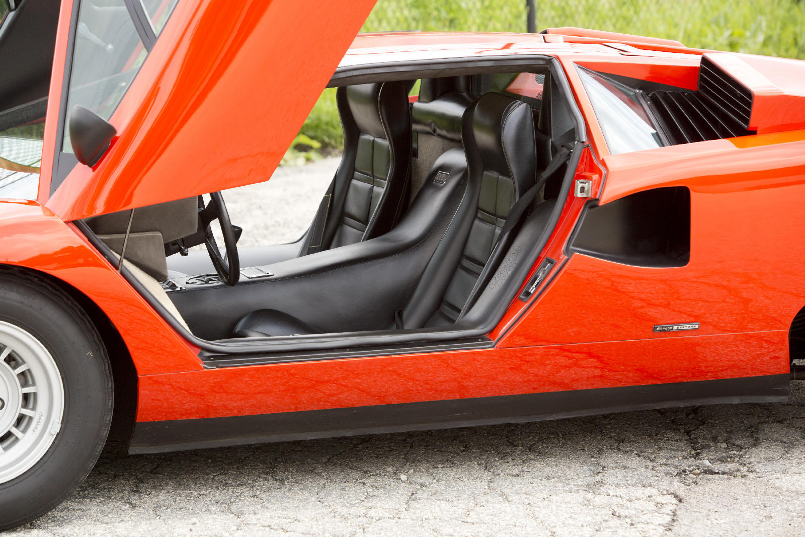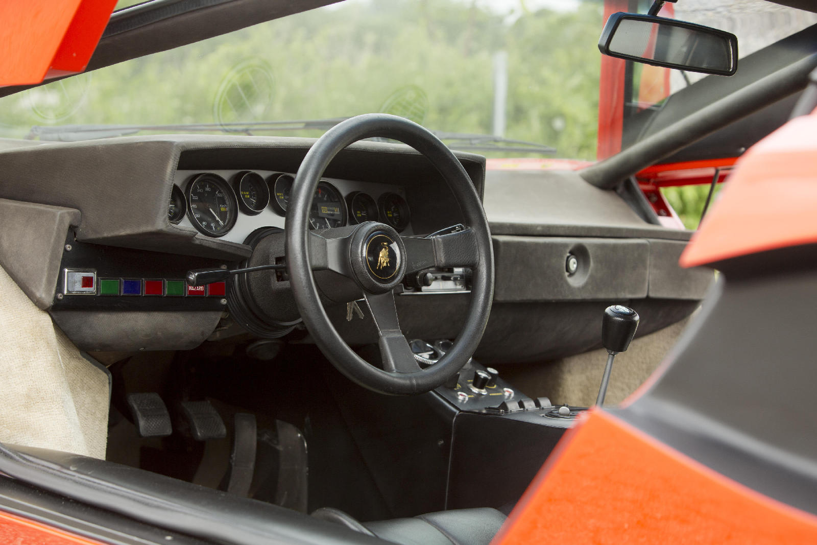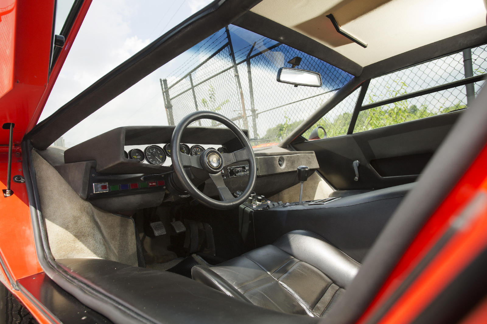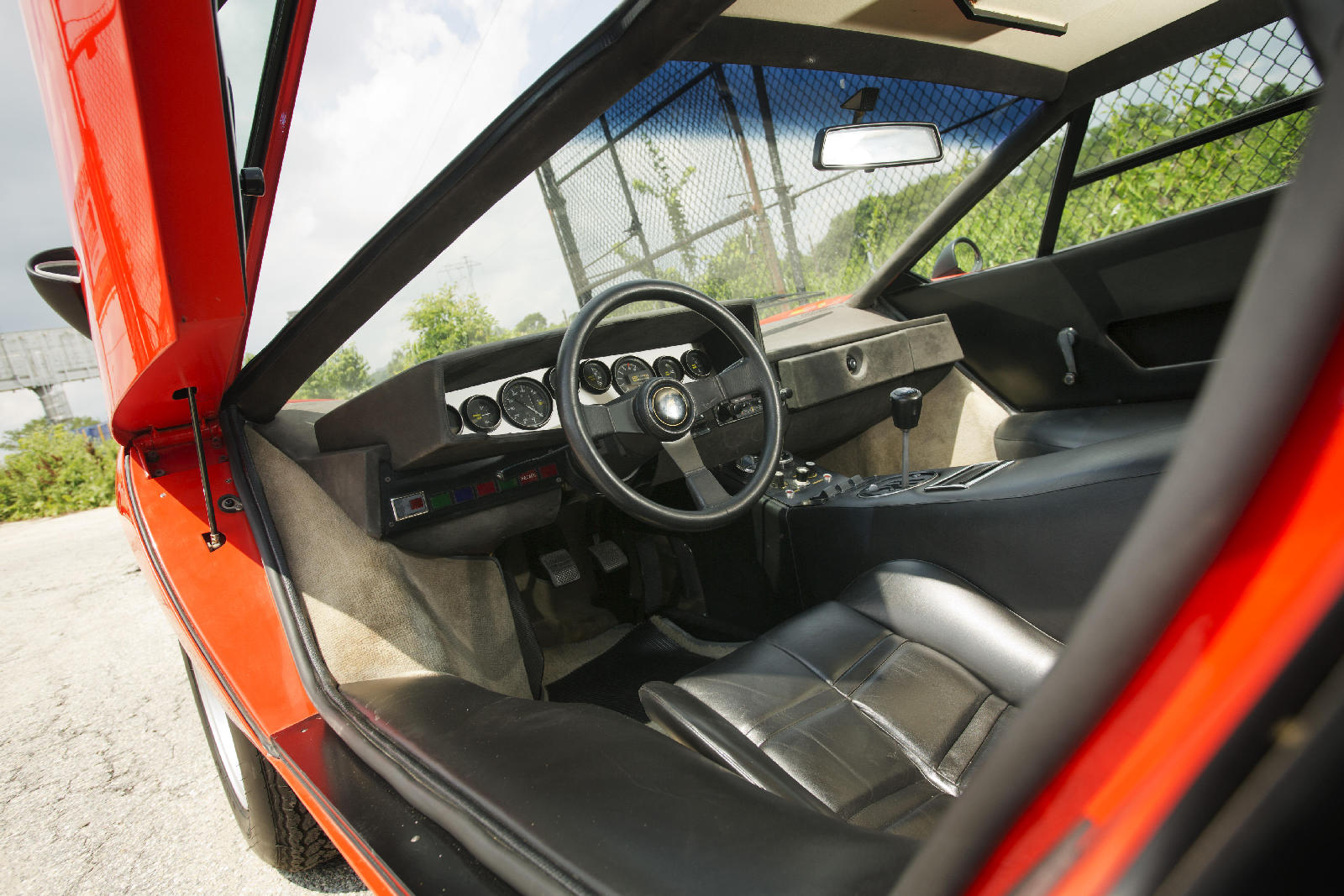 Y si hoy recordamos al fabuloso Lamborghini Countach Periscopica es porque una de esas joyas, el chasis no. 1120126, producido en el segundo año de producción del modelo, en 1975, sale a subasta. Salió de la fábrica como ves en las fotos, pintado en Rosso Lamborghini, ese rojo anaranjado quemado, con el interior negro.