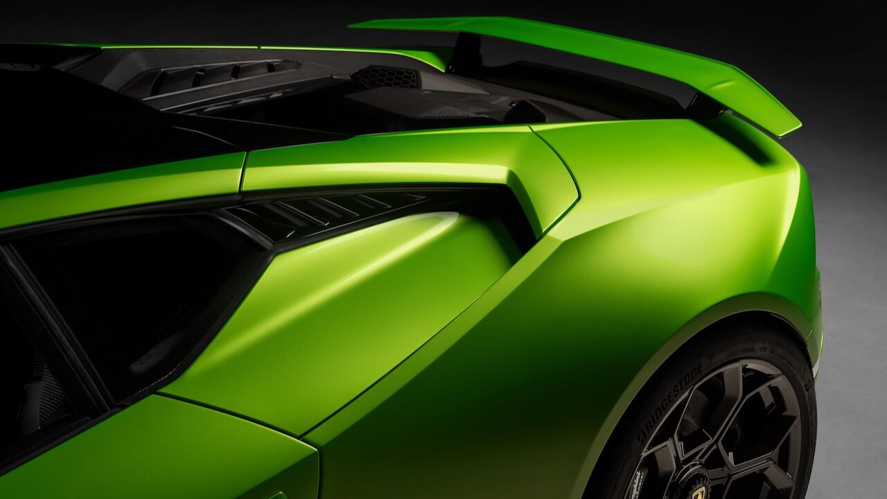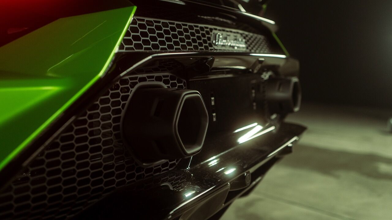 Se nota en el frontal, con un paragolpes que se inspira en el del Lamborghini Terzo Millennio y que introduce por primera vez una cortina de aire. También optimizan el flujo del aire el splitter delantero o el alerón trasero. Los cambios se traducen en un aumento de su longitud de 6,1 centímetros respecto al Huracán EVO, manteniendo su anchura y altura, con una silueta que recuerda más a la del Essenza SCV12. El resultado es un aumento del 35 % de la carga aerodinámica en el eje trasero y una reducción del 20 % de la resistencia aerodinámica. No pasan desapercibidos detalles como sus nuevas llantas de 20 pulgadas o las salidas de escape rediseñadas.