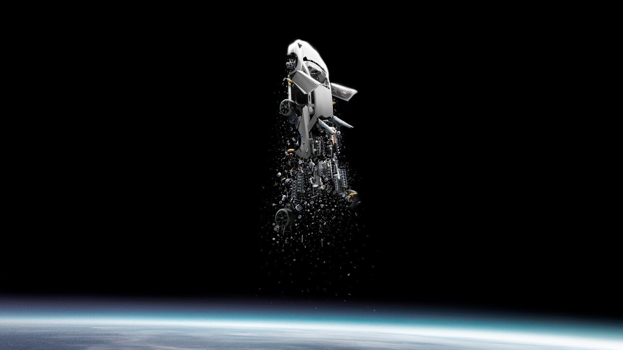 La Space Key de Lamborghini viene con grabados y un código QR únicos. Estas piezas de fibra de carbono vinculan el elemento digital con una serie de cinco fotografías de un Lamborghini Ultimae despegando hacia las estrellas. Las imágenes representan cinco momentos separados con segundos de diferencia cuando el superdeportivo se eleva como un cohete sobre la Tierra. Todas sus piezas, el motor, la transmisión, la suspensión y cientos de tornillos y tuercas salen disparados del chasis como la llama de escape del mencionado cohete.