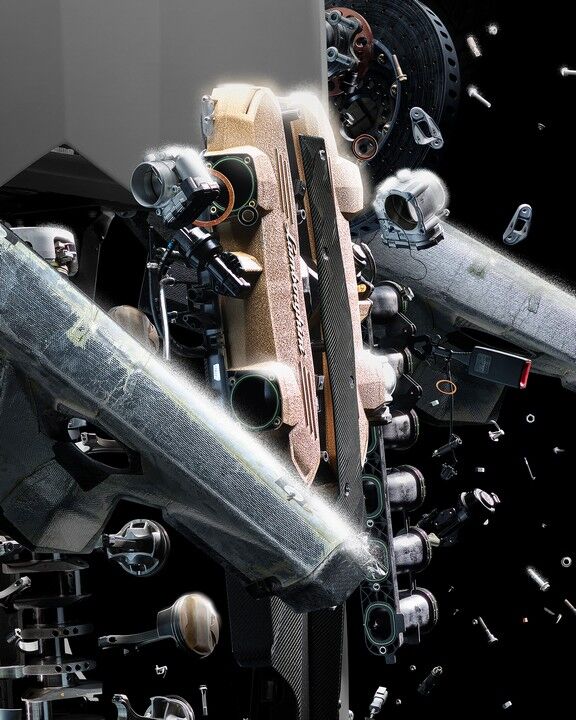 Al comienzo del proyecto, Oefner estudió meticulosamente los planos del Aventador Ultimae y creó un boceto preciso de cómo se verá la fotografía final. Sobre la base, Lamborghini preparó todas las piezas y componentes necesarios de un Ultimae de producción. Luego, Oefner y su equipo fotografiaron las piezas en un estudio improvisado al lado de la línea de producción en la fábrica. A su regreso a su estudio en Nueva York, Estados Unidos, combinó las innumerables imágenes en la composición prevista en el boceto.