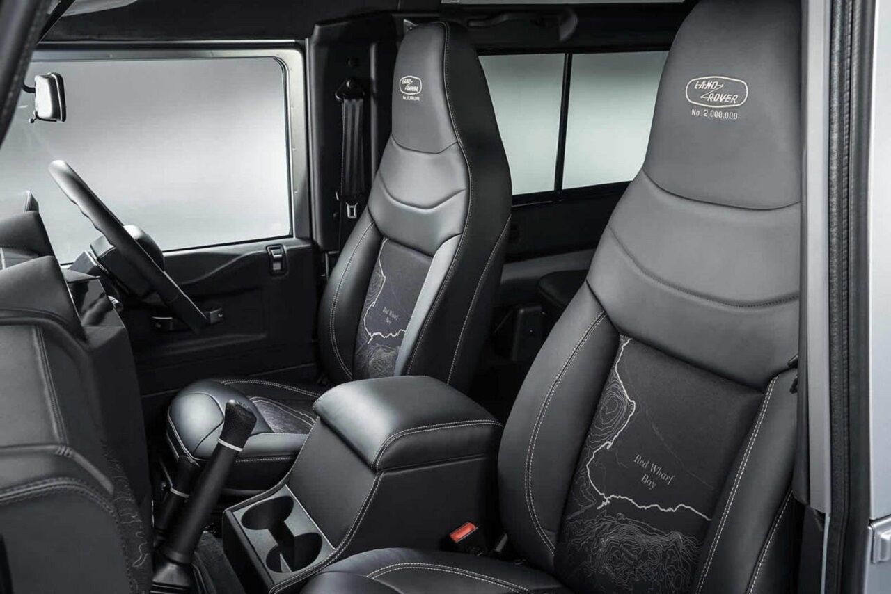 El Land Rover Defender 2.000.000 cuenta con infinidad de elementos distintivos, por ejemplo el guardabarros de aluminio tiene grabado un mapa de la Bahía de Red Wharf, donde se dibujó en la arena el diseño del Land Rover original. La parte trasera del vehículo está adornada con el número de unidad 2.000.000, que también tiene en la consola interior. También cuenta con elementos diferentes como el color Santorini Black de las ruedas y los pasos de rueda, el techo, las bisagras de las puertas, la rejilla y las cubiertas de los espejos.