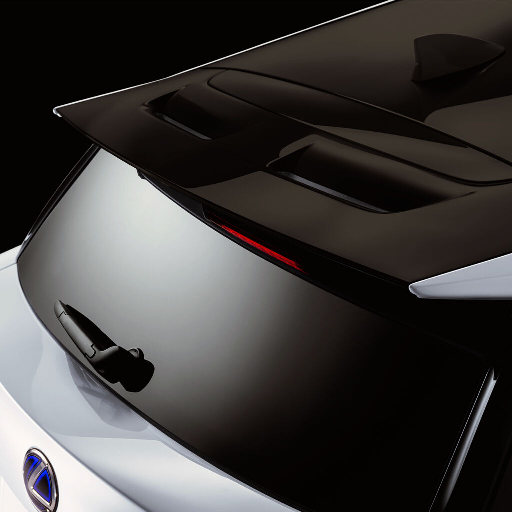 La apariencia exterior cambia con detalles notables como la parrilla frontal o la zona inferior del lateral que incluye una moldura negra. Además incluye llantas negras y brillantes de 17 pulgadas, cristales tintados, alerón sobre el maletero y el curioso y llamativo techo negro. El pilar del parabrisas también se ve alterado respecto al Lexus CT200h que conocíamos. Los faros LED de cruce vendrán incluidos en esta versión además de las luces antinieblas LED con el objetivo de un consumo menos de energía.