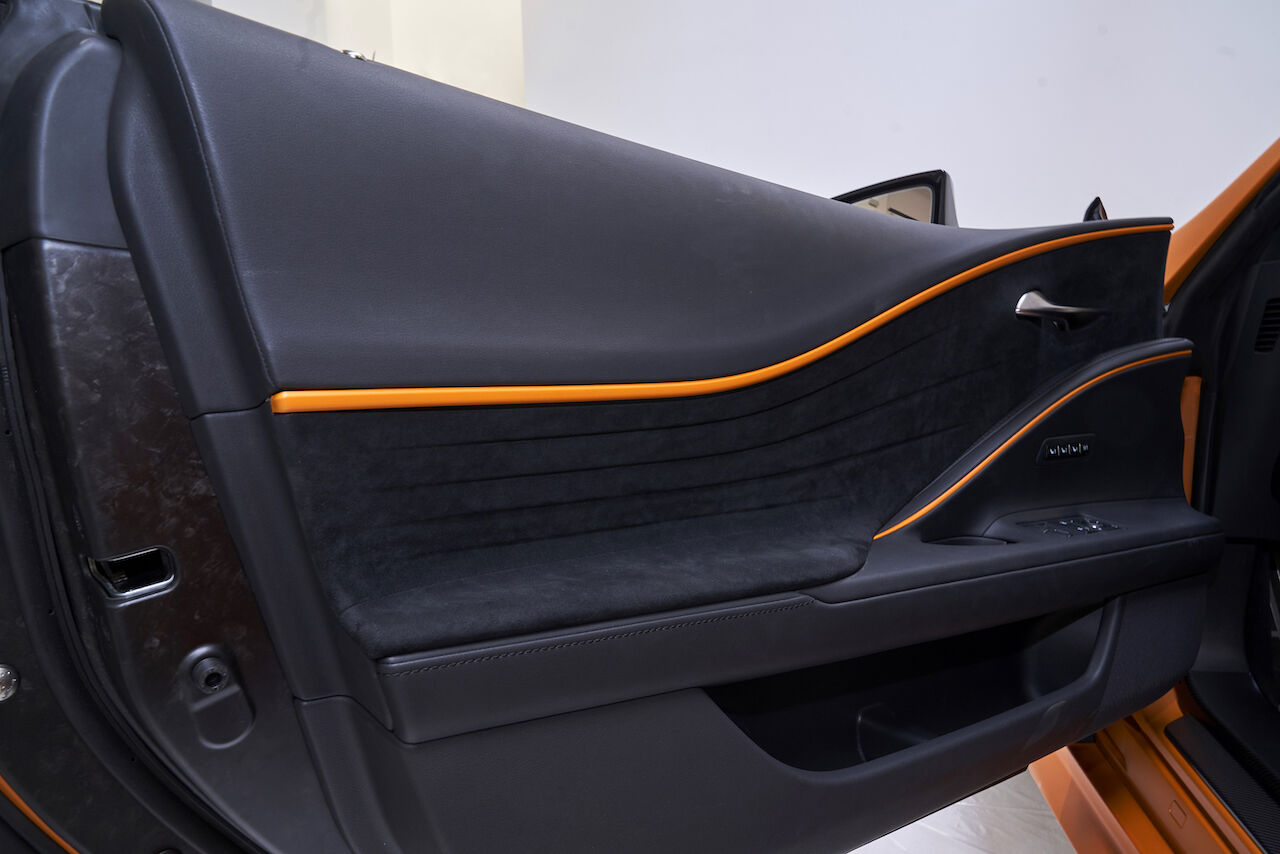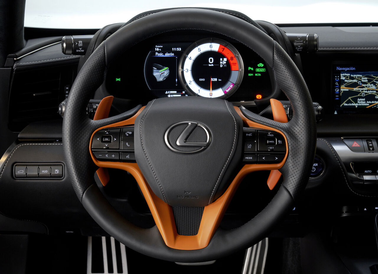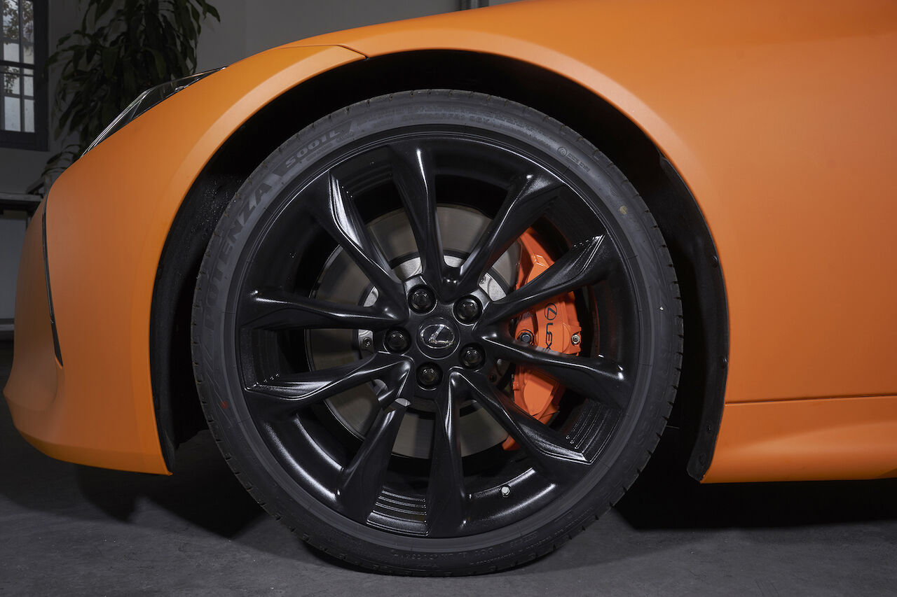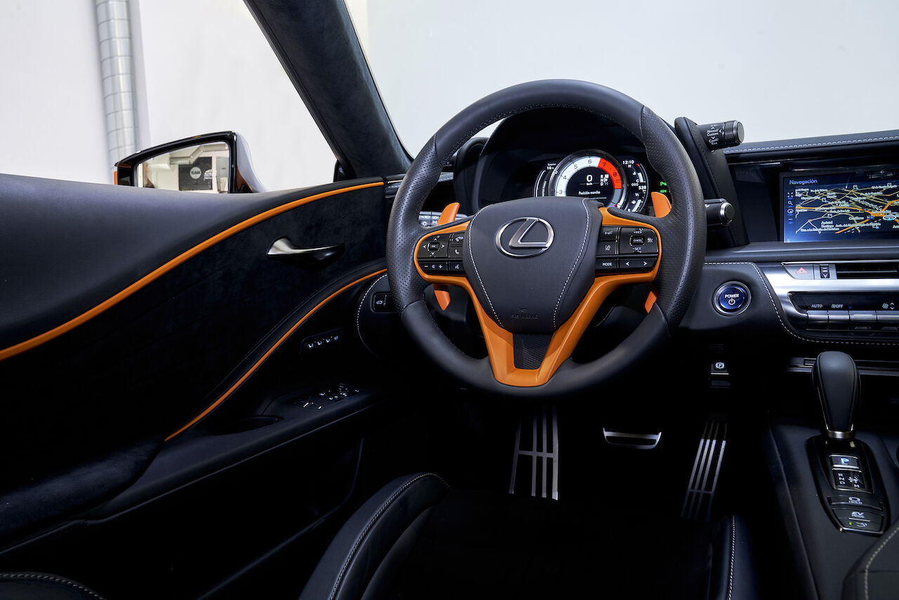 Con este llamativo tono de color no podían faltar algunos elementos que hicieran contraste. Por un lado tenemos las llantas de 21 pulgadas, que ha sido pintadas en un tono negro semi mate. Por el otro lado están las partes de fibra de carbono, que en este Lexus LC 500h Matte Prototype son principalmente el techo y el alerón trasero activo. En el interior también se hace uso del color naranja Space Orange en lugares como la instrumentación, el volante o los laterales de las puertas.