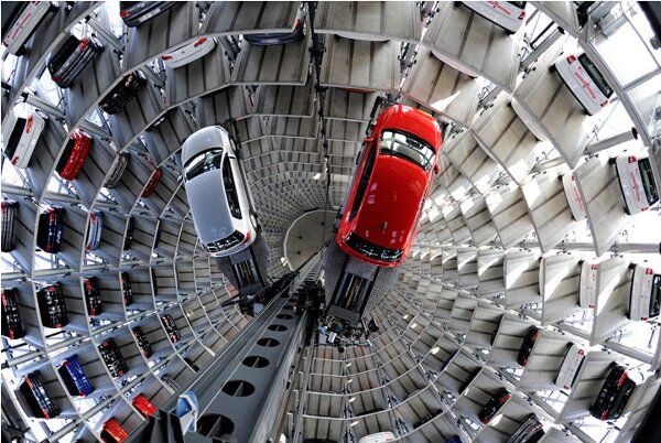 No verás peatones en los garajes automatizados de las torres Autostadt en Wolfsburg, Alemania. En este par de gigantes garajes, los robots levantan y colocan docenas de coches en una matriz de 20 pisos de la forma más eficiente posible. Se guardan los vehículos nuevos que Volkswagen produce en su fábrica. Si tienes la suerte de visitar Autostadt, puedes dar un paseo por estas torres en los brazos robóticos de sí mismo en un cubo de vidrio de seguridad. Eso sí, no mires hacia abajo.