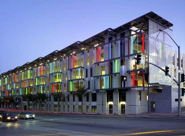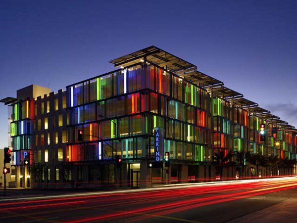 El parking del Santa Monica Civic Center ha sido el primer garaje que obtiene la certificación LEED para edificios sostenibles... además de ser uno de los más impactantes del mundo cuando lo ves desde fuera.
