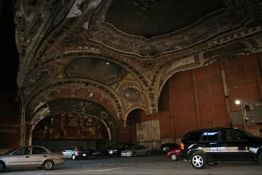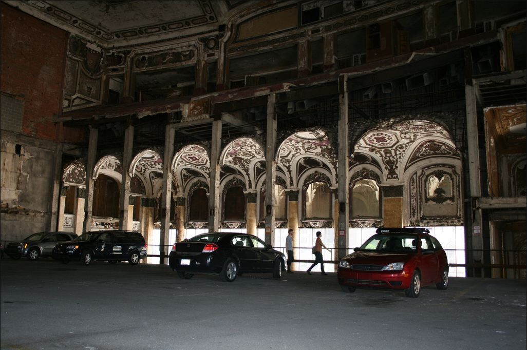 Si los anteriores aparcamientos son auténticos logros en la tecnología y el diseño, el teatro de Michigan convertido en parking es un homenaje a la decadencia urbana.