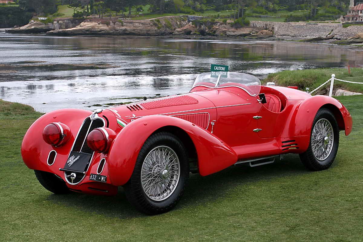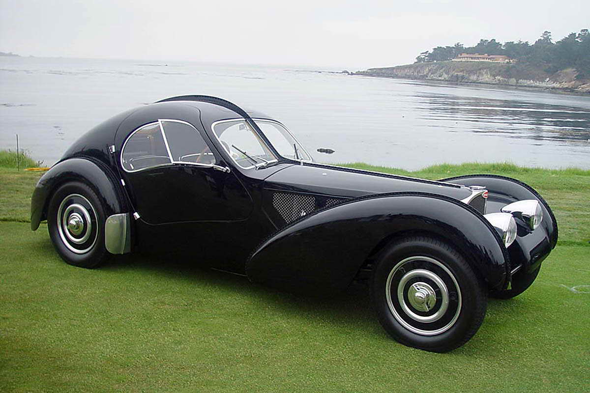 BUGATTI 57 ATLANTIC COUPÉ, 1938. Este es uno de los únicos cuatro modelos que se construyeron, de los cuales hoy en día sólo quedan dos. Este fantástico vehículo se caracteriza por las soldaduras y los remaches visibles en una especie de columna vertebral que recorre toda su carrocería, además de la recortada altura de su techo y las ventanillas con formas elipsoidales, de clara inspiración aeronáutica.