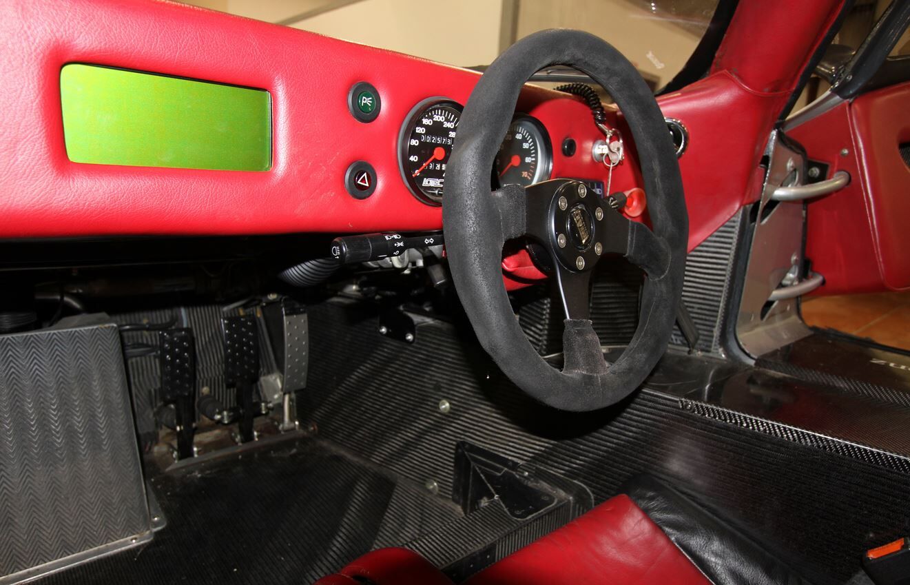 Dentro del coche destacan el cuero rojo y la fibra de carbono, en un habitáculo dotado de asientos tipo bucket con arneses de tres puntos, aire acondicionado, columna de la dirección ajustables y un compartimento para el equipaje.