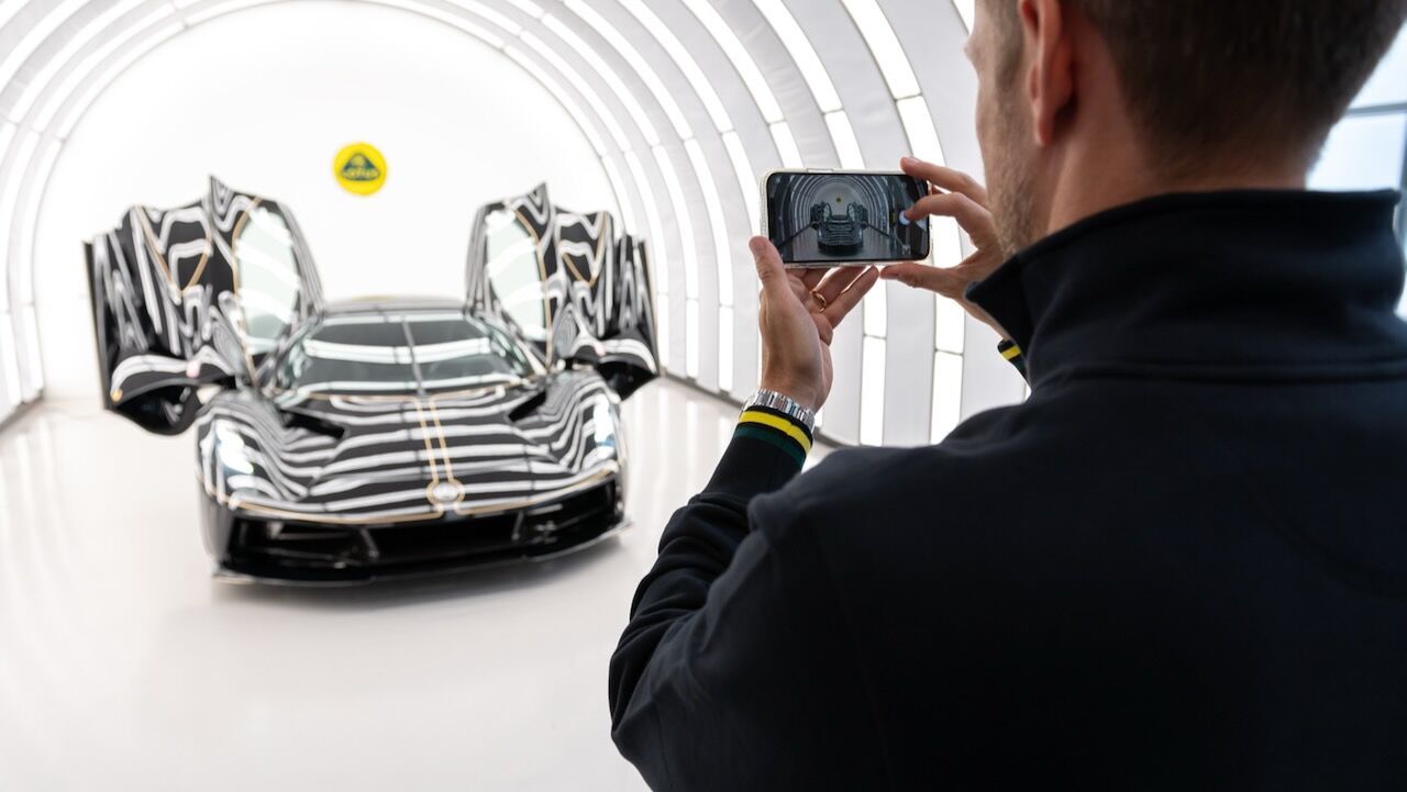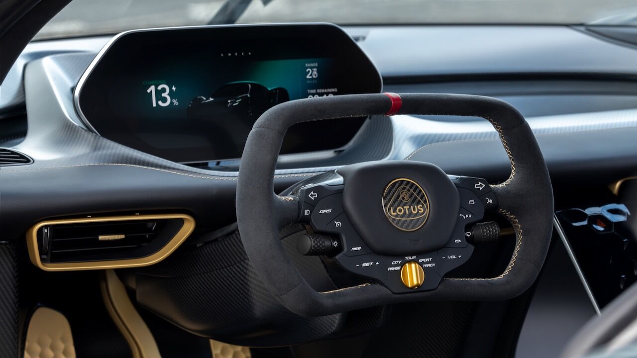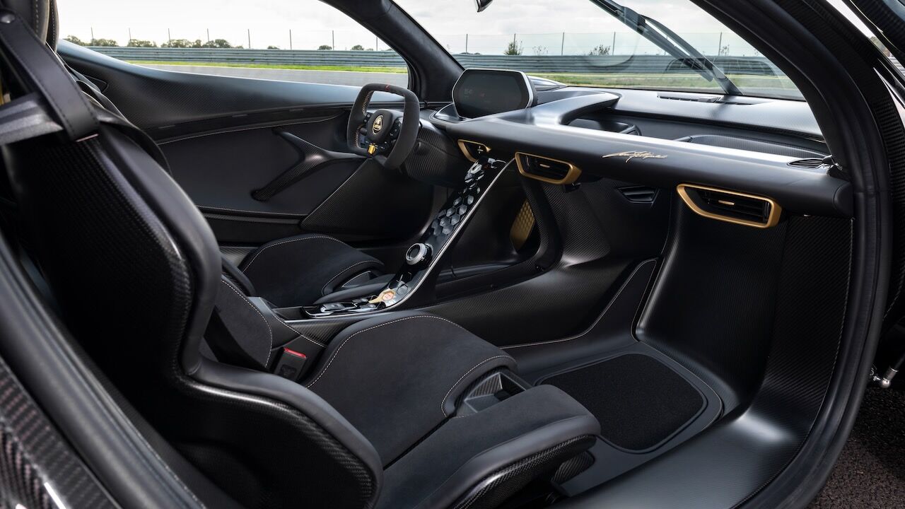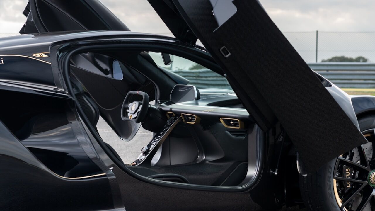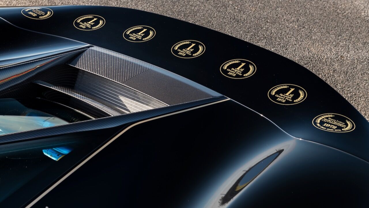 El biplaza eléctrico se viste con la librea negra y dorada, con una carrocería pintada a mano y un gráfico del Type 72 grabado en su techo de fibra de carbono. También se han plasmado las cinco victorias de la temporada en su alerón trasero activo y tiene el número 8 en el pilar B, haciendo honor al que llevaba Fittipaldi. Las llantas son específicas y tienen el mismo acabado, con pinzas a juego. Además, en el interior tiene el panel de instrumentos hecho con aluminio del monoplaza original reciclado, que resalta entre la tapicería de cuero negro con costuras doradas.
