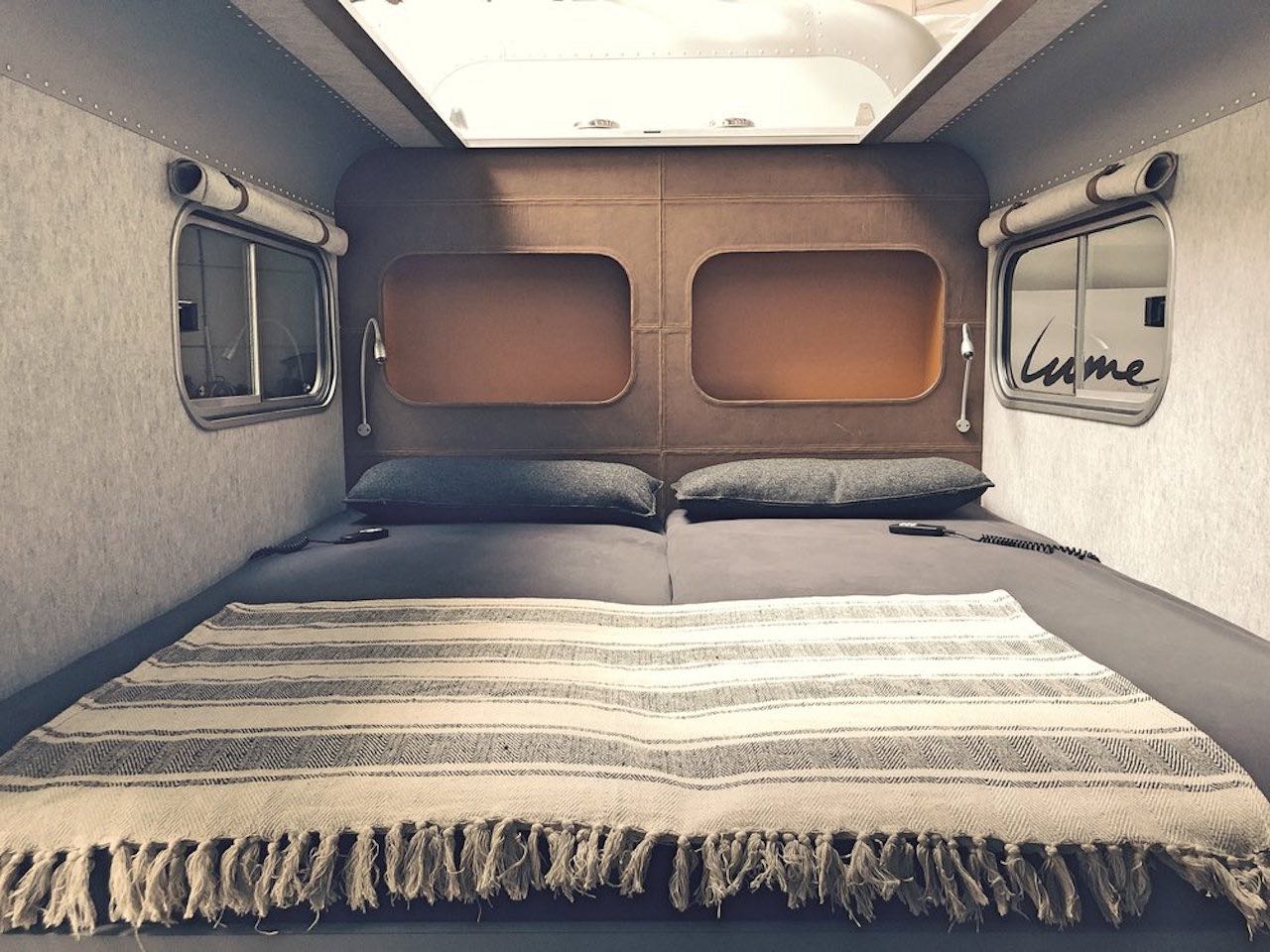En el interior del Lume Traveler se ha puesto especial atención al uso de materiales naturales. Suelo de teca, pared trasera de cuero... crean un ambiente muy diferente al que puedes encontrar en una caravana. De todos modos, en el configurador que tienen en su página, puedes optar por suelos de roble, tapicerías de lino o de madera... La cama ocupa casi la totalidad de ese espacio, pero no todo. Es posible incluir una televisión de 32 pulgadas, Wi-fi o un sistema de sonido Bosé con seis altavoces.