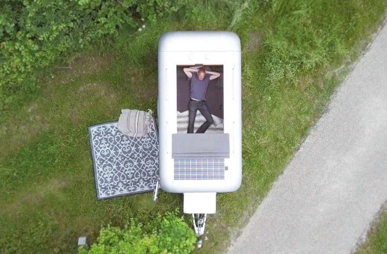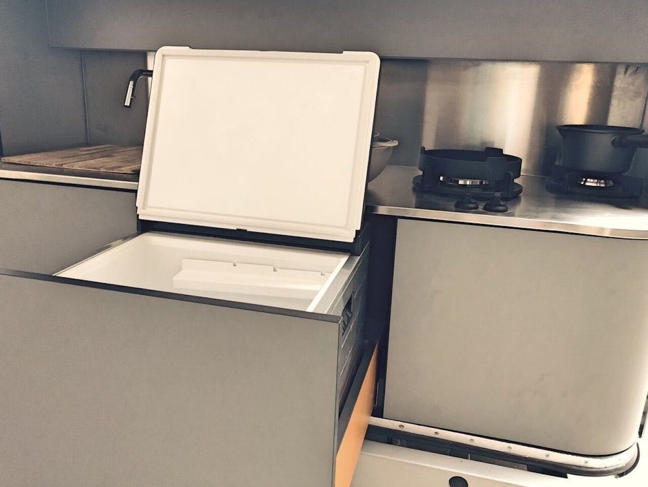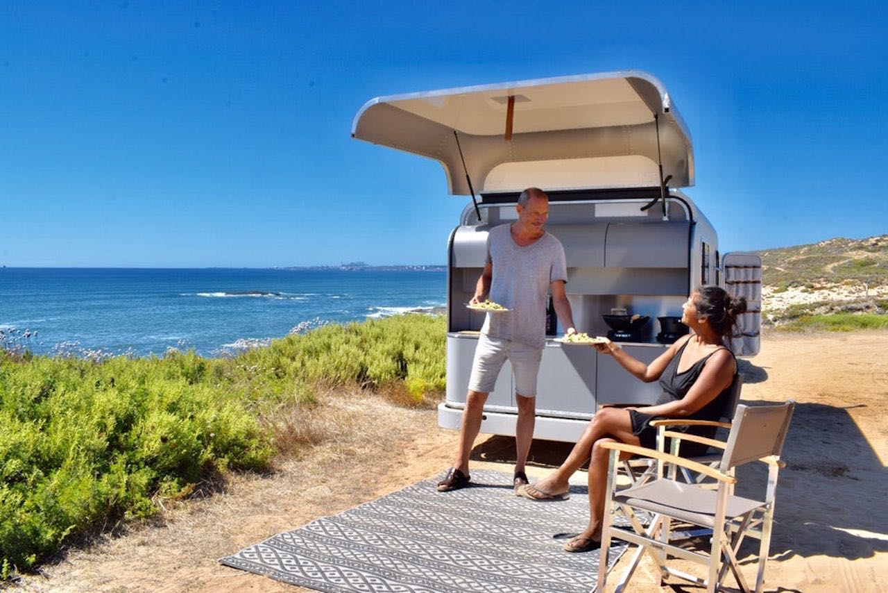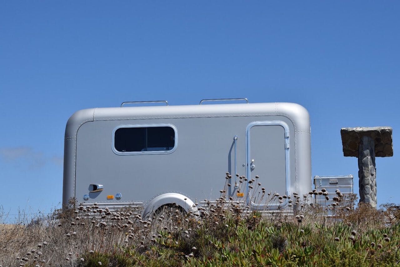 El diseño recuerda un poco al mítico Airstream norteamericano, pero cuenta con detalles que hacen única a esa carrocería de aluminio, como los remaches o las correas de la parte baja. Otra diferencia la encontramos en la zaga: la parte trasera se abre por completo, dando acceso a una cocina al aire libre, con un diseño muy minimalista que podrías encontrar en un apartamento moderno.