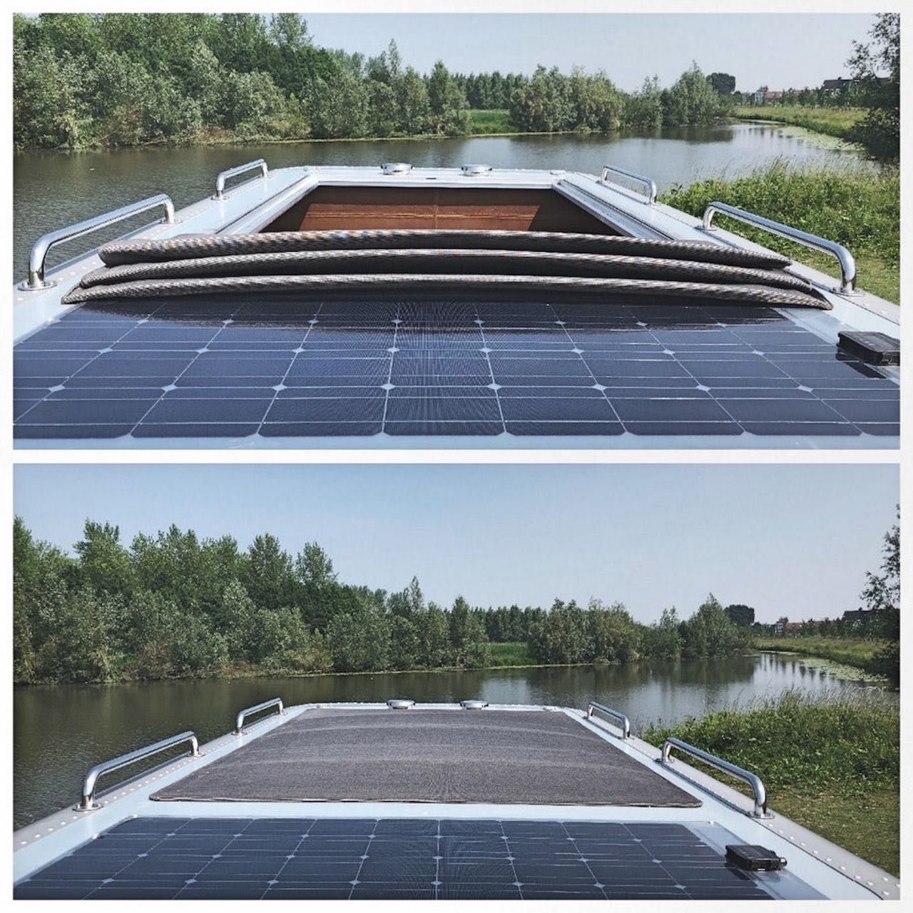 Pero sin duda, el gran punto a favor de este remolque es esa capota retráctil de 1,85 x 1,1 metros que se puede abrir. No del todo, pues comparte el tejado con un panel solar de 100 vatios que ayuda a alimentar el equipo a bordo.