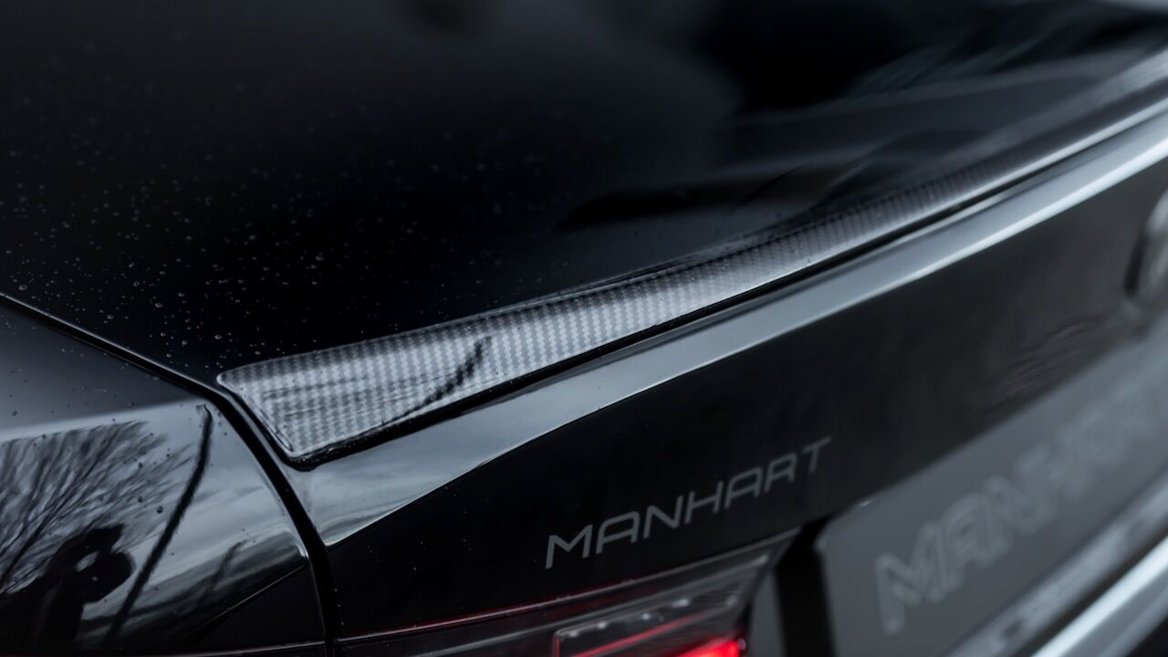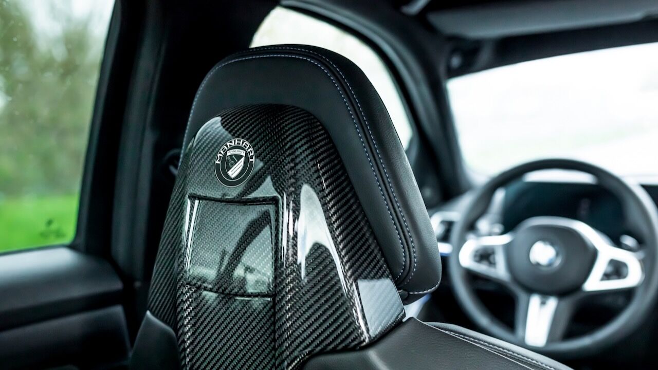 En el interior, los asientos deportivos M de fábrica incluyen refinados detalles en carbono, a saber, las levas de cambio de carbono y umbrales de puertas Manhart iluminados para un toque adicional de exclusividad.